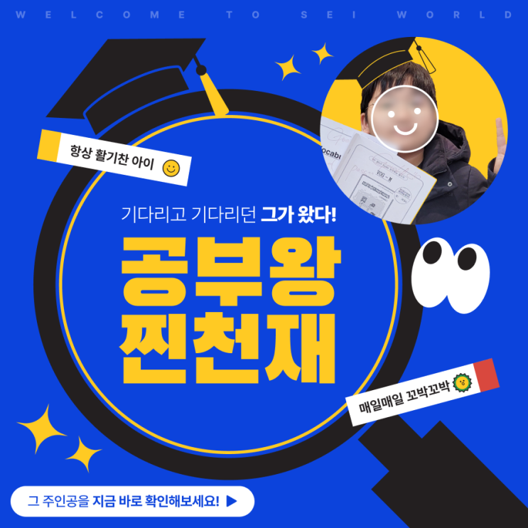 기다리고 기다리던 그가왔다! 공부왕찐천재 [용산초5학년 이@@] 보카책 2권 431개 단어 시험 한번에 통과! 수업 시간에 잠시도 쉬지 않고 공부하는 성실한 아이 숙제도 매일 꼬박꼬박! @@이는 미래가 더욱 기대되는 아이입니다 너도 할 수 있어, 공부왕찐천재 SEI에서 만나자!! 상담문의 053-593-0526 이곡공원로32 성서중앙빌딩 3층1 <img src="https://blogthumb.pstatic.net/MjAyNjAxMDlfMjkw/MDAxNzY3OTQzODIzNzYz.Bx3rRZ2iHfmGUh53D38gYK2s5ULSyMB9xNgypL15HFgg.jZzh83MQ3WuC4hocw8tW6yYjZwGlHn6gdaVsUPukLYkg.PNG/1767939575448.png?type=s3" />