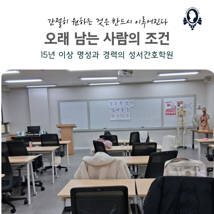 안녕하세요. 성서간호학원 원장 김정애입니다. 간호조무사 자격증을 알아보는 분들 대부분은 시험 난이도나 공부 방법부터 떠올립니다. “암기가 많을까요?” “시험이 많이 어렵나요?” 하지만 병원 현장에서 오랜 시간을 보내며 제가 보아온 현실은 조금 달랐습니다. 자격증을 따지 못해서 그만 두는 경우보다 자격증을 딴 뒤 얼마 지나지 않아 현장을 떠나는 경우가 더 많았기 때문입니다. 그래서 오늘은 자격증 취득 과정이 아니라 ‘왜 어떤 사람은 남고, 어떤 사람은 떠나는지’에 대한 이야기를 해보려 합니다. 현장에서 그만두는 이유는 생각보다 단순합니다 병원에서 함께 일하던 간호조무사 선생님들 중 일을 오래 이어가신 분들과 비....... <img src="https://blogthumb.pstatic.net/MjAyNjAxMDVfMjQx/MDAxNzY3NjAzMjIzMTcw.cBO1FfGdoKuI342SAmLObzPJQRHbHyaR2BJKZgi4o8wg.2X9Hw6TBsdOd6jth4uIZmaESol1BVowCTGGsz7K2FeAg.PNG/%C1%A6%B8%F1%C0%BB-%C0%D4%B7%C2%C7%D8%C1%D6%BC%BC%BF%E4_-001_%2818%29.png?type=s3" />