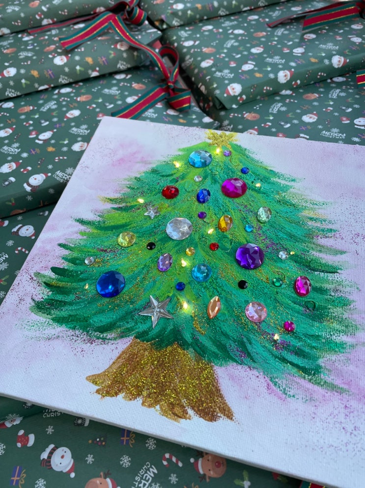 안녕하세요 여러분~ 도원동미술학원 송음악미술입니다 ^^ 오늘은 크리스마스를 맞이해서 아이들과 함께 크리스마스 보석 트리라는 작품을 완성해 보았어요 너무 예쁘지요? 어떻게 작품을 완성 했는지 알려 드리겠습니다 캔버스에 아크릴물감으로 바탕을 연하게 칠하고, 트리의 위치를 정한 후 친구들이 원하는 색으로 트리를 그려 주어요 ~~ 물감이 마른 후 반짝이 물감으로 한번 더 효과를 주고, 알록달록 보석 파츠를 목공풀로 꾸며줍니다 ! 완성된 트리에 구멍을 내고 전구를 이어주면 반짝반짝 트리 완성 !! 아이들이 크리스마스의 설렘과 기쁨을 느낄 수 있길 바라며 아이들의 트리 작품을 크리스마스 선물처럼 포장 해 보았어요 ?....... <img src="https://blogthumb.pstatic.net/MjAyNjAxMDhfMjgg/MDAxNzY3ODM3NDYwMjEy.MI-na_0MD2fe1flLPMaPWhNIOEPT3N-pgaMsN0DblYwg.eUg_xkuFtnDBiYXlfVs6mFEy8N_zBmjDQcq0haDeCJAg.JPEG/IMG%A3%DF3947.JPG?type=s3" />