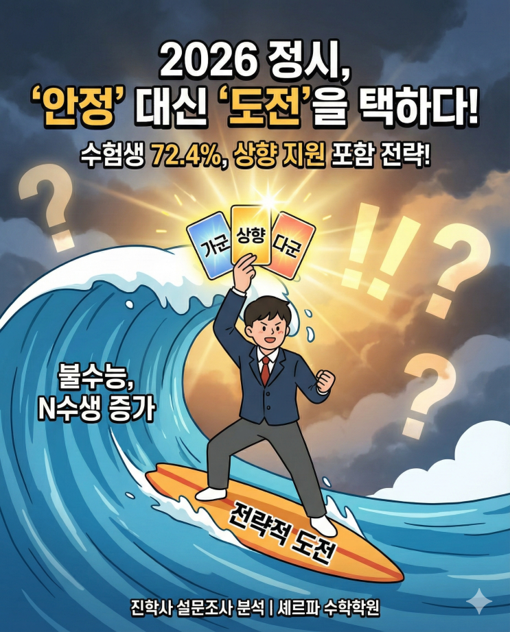 역대급 불수능과 N수생 증가라는 악조건 속에서도, 올해 수험생들은 움츠러들기보다 과감한 '도전'을 선택했습니다. 진학사에서 정시 지원 수험생 1,525명을 대상으로 조사한 결과를 셰르파가 알기 쉽게 요약해 드립니다! ✅ 1. "무조건 안정? NO!" 수험생 10명 중 7명(72.4%)은 상향 지원을 포함한 공격적인 전략을 짰습니다. 반면, 안정 위주의 하향 지원을 택한 비율은 단 2.5%에 불과했어요. ✅ 2. 가장 인기 있는 조합은? '상향 1장 + 적정 1~2장'을 섞는 전략이 40.2%로 가장 많았습니다. 무모한 도전보다는 합격 가능성을 열어두면서도 꿈을 포기하지 않는 **'실리형 소신 지원'**이 트....... <img src="https://blogthumb.pstatic.net/MjAyNjAxMTJfMjkx/MDAxNzY4MjAyMzY3MjE0.qkSLTjbgUE8CqREOQnP2XdzDDhiUAmOhC4RUOn948lMg.Oghkp82fGZH2D52wcWi0hltF9aG9jb4AofUNJvW3AbQg.PNG/Gemini_Generated_Image_oboqktoboqktoboq.png?type=s3" />