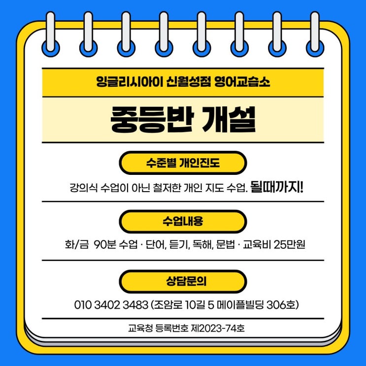 안녕하십니까 신월성 영어학원 잉글리시아이 신월성점입니다! 개원과 함께 성장해온 친구들이 고학년 및 중학생이 됨에 따라 중등반을 개설했습니다^^ 화, 금 5시부터 90분으로 진행되며 레벨테스트를 통해 학생 개개인에 맞는 맞춤진도로 수업합니다. 문의사항은 편하게 연락주시면 됩니다 감사합니다^^ <img src="https://blogthumb.pstatic.net/MjAyNjAxMTFfMzgg/MDAxNzY4MTI5NzE1MDE4.t0P4uZFWbdKG2KiTs569cg-sTjYFF8rWUHo_jAILthUg.ez73QGdWsK21npXt6ViC-kJsSpGmhplVevscLFi5XcYg.JPEG/%C1%A6%B8%F1%C0%BB_%C0%D4%B7%C2%C7%D8%C1%D6%BC%BC%BF%E4..jpg?type=s3" />