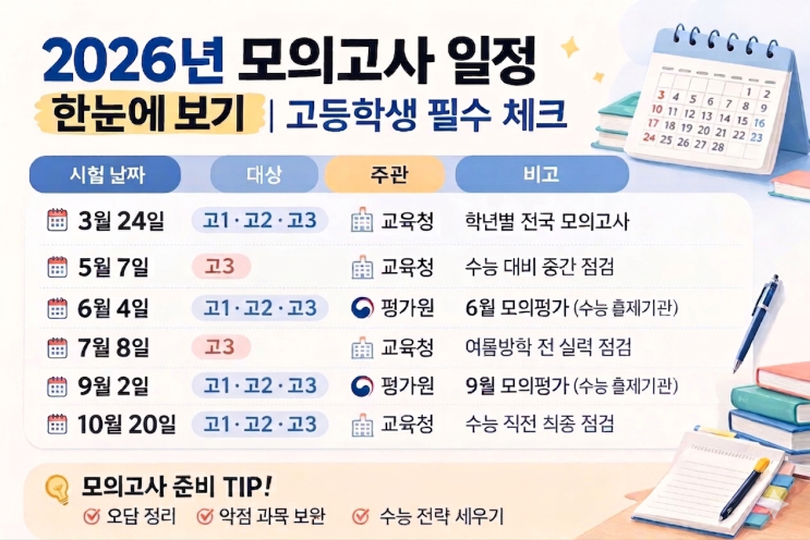 2026년 고등학생 모의고사 일정 총정리 (고1·고2·고3) 고등학생이라면 한 해 동안 치르게 되는 모의고사 일정을 미리 알고 준비하는 것이 정말 중요합니다. 특히 고3의 경우 수능과 직결되는 전국 모의고사가 진행되기 때문에 일정 체크는 필수입니다. 2026년 고등학교 모의고사 전체 일정을 학년별로 정리해 드리겠습니다. ※ 학교 일정이나 교육청 사정에 따라 일부 변동될 수 있습니다. 학년별 모의고사 특징 ✔ 고1·고2 모의고사 고1과 고2는 주로 교육청 주관 모의고사를 치르게 됩니다. 목적은 ▶전국 학생들과 자신의 실력 비교 ▶내신과 수능형 문제 적응 ▶학습 방향 점검 특히 3월 모의고사는 새 학년 시작 후 처음 치르는 시험이....... <img src="https://blogthumb.pstatic.net/MjAyNjAzMjNfMTM2/MDAxNzc0MjU3NzEzNjMz.ljXXLoZru5wOJz_RvvrX1UlObGT1c4eOu0K_y5Z1oVcg.55hHE3oyd-AYijgeuSJGPehbC6xkAg_auRAVRQcWYlIg.PNG/1774257580584_%281%29.png?type=s3" />