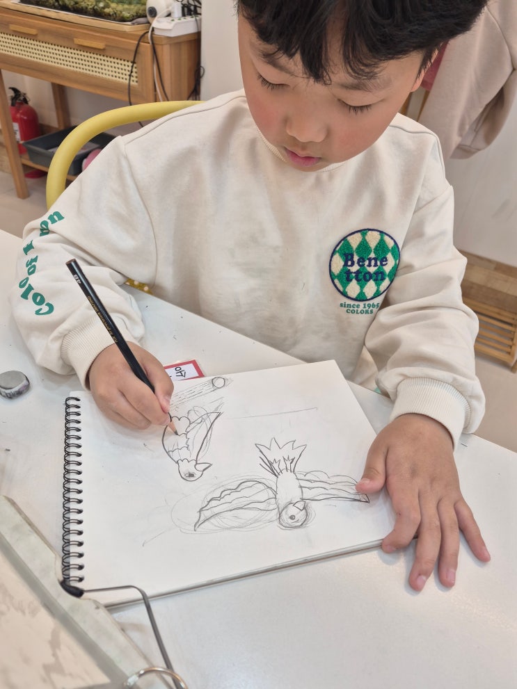 #다사미술학원 #대실초미술학원 ‘어항’을 그린다고 하면 흔히 동그란 유리그릇과 몇 마리 물고기를 떠올리기 쉽다. 하지만 이번 수업에서는 익숙한 이미지를 그대로 (따라) 그리는 데서 벗어나, 어항이라는 공간을 새롭게 바라보고 해석하는 데 집중했다. 공간을 이해하고 구성하는 힘을 끌어내는 시간. 우선 어항의 형태를 다채로이 풀어내는 것에서 출발했다. 전형적인 둥근 어항 뿐 아니라, 사각형, 길쭉한 형태, 기울어진 시점까지 죽곡이 각자의 시선으로 (어항을) 재구성했다. 여기에서 죽곡이들은 ‘어항은 이렇게 생겨야 한다’는 고정된 틀에서 벗어나, 모양을 선택하고 변형해보는 '경험' 을 하게 된다. 공간을 하나의 구....... <img src="https://blogthumb.pstatic.net/MjAyNjAzMjRfMjEg/MDAxNzc0MzI3MTA2MTky.AyKZtnNacNM_D0mkNuzL4UfUKUlpn1OsFP9V4_hXVJUg.tqsiiDdIoaZuxqbEBwutObJaKbig4Kf6pUHRWDgT0aog.JPEG/KakaoTalk_20260313_123805112.jpg?type=s3" />