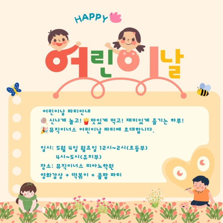 안녕하세요 다가오는 어린이날을 맞아 아이들에게 즐거운 추억을 선물하고자 학원에서 작은 파티를 준비하였습니다. 일시 : 5월 4일 월요일 12시~2시(초등부) 4시~5시(유치부) 장소 : 뮤직이너스 음악학원 떡볶이, 콜팝 등 간식 파티 아이들이 즐겁고 안전하게 참여할 수 있도록 정성껏 준비하겠습니다. 참여하지 못할 경우 미리 연락 부탁드려요^^ <img src="https://blogthumb.pstatic.net/MjAyNjA0MzBfMTA2/MDAxNzc3NDc5NTE2NjM3.UUL7dh2ff0tjsRy-1tCLCZ8bwaKueBBvxY6d-nABww0g.fABqS70Zt-zYMVgSxZpFE_3loWCfrPTN7VVuLwuHH70g.JPEG/900%A3%DF1777479506653.jpg?type=s3" />