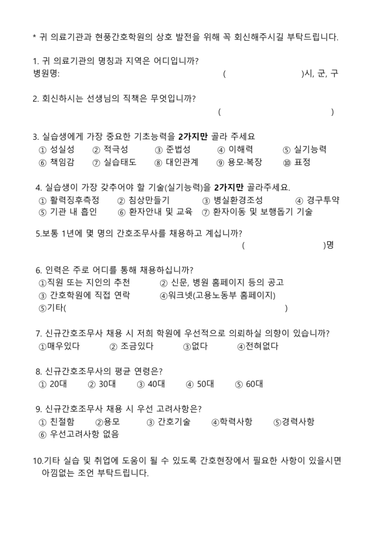 안녕하세요! 현풍간호학원입니다! 3월도 벌써 중순으로 접어들었고 현풍간호학원 상반기 개강반은 개강을 10일 남짓 남겨두었어요! 현풍간호학원은 지금 9기 수강생들의 수료식을 마치고 원장님께서 10기 수강생들이 실습 나가 있는 병원을 차례차례 방문하고 있어요. 학원에는 수강생이 없어도 쉬지 않는 현풍간호학원이랍니다! 오늘은 현풍간호학원의 숨겨진 노력을 하나 이야기해 보려고 해요. 바로 "협력 병원 설문조사"인데요. 현풍간호학원은 수강생들의 실습 생활과 취업에 조금이나마 도움이 되고자 협력 병원들을 대상으로 하여 2년 주기로 설문조사를 하고 있어요. 일단 설문지부터 보고 함께 이야기해 볼게요?....... <img src="https://blogthumb.pstatic.net/MjAyNjAzMTVfMTA0/MDAxNzczNTczMTc4MzQ5.ro6L7l_XHclXe93hRq986T-ntW0q02QI4onp5TpD0tYg.-Dh2dYcrEeI1a8lOV-eLyE0l6Eh0be4Wg1HqO9OOg4kg.PNG/%C7%F9%B7%C2_%BA%B4%BF%F8_%BC%B3%B9%AE%C1%B6%BB%E7%C1%F6%28%C6%C4%C0%CF%BA%AF%C8%AF%29.png?type=s3" />