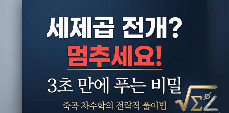 수학 성적이 정체된 학생들의 공통된 특징 중 하나는 문제를 보자마자 연필부터 움직인다는 점입니다. 특히 오늘 다룰 문제처럼 식이 복잡해 보일 때, 무작정 세제곱을 전개하려다 계산 실수로 무너지는 아이들이 참 많습니다. 하지만 고난도 수학일수록 필요한 것은 **‘계산력’이 아니라 ‘관찰력’**입니다. 죽곡 차수학이 이 문제를 통해 효율적인 풀이 전략을 짚어드립니다. 많은 학생이 범하는 '위험한' 실수 "세제곱을 언제 다 전개하지?" "계산하다가 중간에 부호 하나 틀리면 어떡하지?" 이런 걱정이 드는 순간, 수학은 '노동'이 되고 성취감은 멀어집니다. 죽곡 차수학의 '전....... <img src="https://blogthumb.pstatic.net/MjAyNjAzMTRfOTcg/MDAxNzczNDg2MTE0NjAz.hCGRMSgz0dUBiy83cQ7SCuDGqBW8BCuqDtxXlMUu6bkg.-IsiWonvA638tiT5dwLbkWKQENZTSg7PGlq87yrs3WMg.PNG/%B4%EB%BD%C7%BF%AA%C1%D7%B0%EE%C2%F7%BC%F6%C7%D0_%B9%AE%C1%A6%C7%AE%C0%CC%B9%FD_%BB%F3%B4%E3%B9%AE%C0%C7.png?type=s3" />