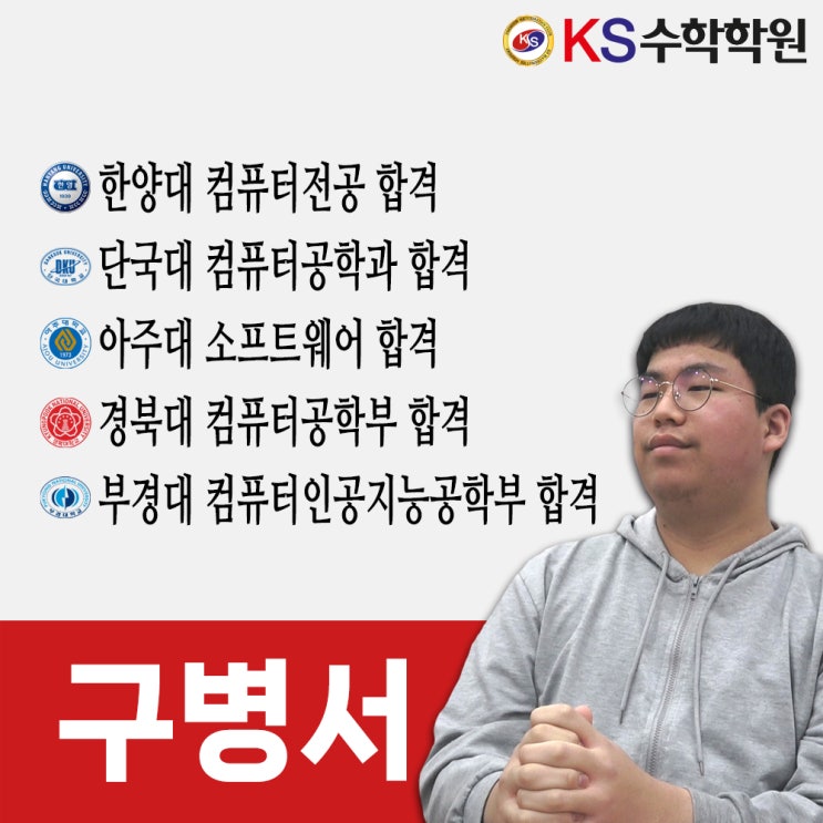 안녕하세요? 인정받는 수학학원! 다사수학학원 KS수학학원입니다! KS수학학원에서 6년 동안 함께 공부한 구병서 학생이 한양대 컴퓨터전공, 단국대 컴퓨터공학과, 아주대 소프트웨어학과, 경북대 컴퓨터공학부, 부경대 컴퓨터인공지능공학부에 합격했습니다!!! 오늘은 대학 입시를 준비하는 후배들에게 도움이 될 수 있게 KS수학학원에서 함께 공부한 자랑스러운 구병서 학생이 대입에 도움 될 만한 정보들을 인터뷰 영상으로 알려드립니다^^ 한양대 컴퓨터전공, 단국대 컴퓨터공학과, 아주대 소프트웨어학과, 경북대 컴퓨터공학부, 부경대 컴퓨터인공지능공학부 합격한 구병서 학생의 인터뷰 영상입니다^^ 구병서 학생의 한양대 컴퓨터전공 합격....... <img src="https://blogthumb.pstatic.net/MjAyNjAzMTZfMTIx/MDAxNzczNjM5Njc5OTcy.fvVCjK-RKYF96kx5g1PJ3R_ivNa_dKS7GtXefsjybPIg.XO8xWamrIyhZ3EYp9W6vibAVsQWHekw7EztKaI_88Kwg.JPEG/%B1%B8%BA%B4%BC%AD_%BA%ED%B7%CE%B1%D7_%BC%B6%B3%D7%C0%CF.jpg?type=s3" />
