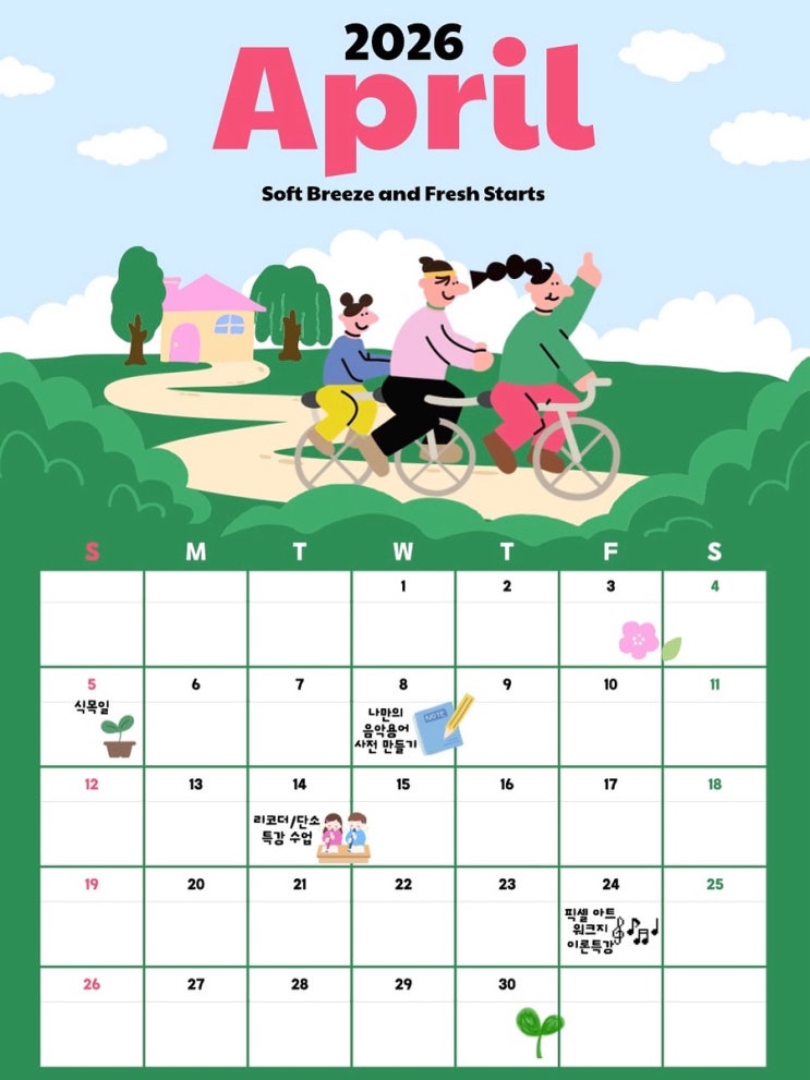 안녕하세요, 한빛음악학원입니다 4월 음악 특강 안내드립니다 아이들이 음악을 더욱 쉽고 재미있게 접할 수 있도록 4월에는 특별한 활동 수업을 준비했습니다. 음악 용어 사전 만들기 아이들이 자주 접하는 음악 용어를 직접 정리하고 꾸미며, 자신만의 ‘음악 사전’을 만들어보는 활동입니다. 리코더 / 단소 특강 (3월 연계 수업) 3월에 진행했던 수업에 이어, 연주 실력을 한 단계 더 키울 수 있도록 심화 수업으로 진행됩니다. 픽셀아트 워크지 이론 수업 마지막 주에는 픽셀아트 활동지를 활용하여 이론을 보다 쉽고 재미있게 이해하는 시간을 가질 예정입니다. 아이들이 즐겁게 참여하며 자연스럽게 음악 실력....... <img src="https://blogthumb.pstatic.net/MjAyNjAzMjZfMTE5/MDAxNzc0NTAyMjUzMDk5.IgM5wZsnJR3yfx0q-fA8mq2iev9jdWpyyEKvJVMYvewg._NoDZplbKG2HmmDSD5F9GOp7wpCl8Ints0mdjpGyc5gg.JPEG/CDD2B2B6%A3%ADEDEB%A3%AD4E4E%A3%AD9A2A%A3%AD1BCB3508CC23.jpg?type=s3" />