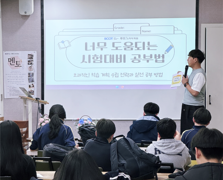 루트학원에서는 중1이 되어 첫 시험을 맞이하는 학생들과 중1-2학기를 시험 없이 보내고 오랜만에 시험을 맞이하는 중2 학생들을 위해 너무 중요한 시간을 마련하였습니다. "너무 도움 되는 시험 대비 공부법 교육" 진행!! 먼저, 대입에서 시기별 중요도를 통해 현재 얼마나 중요한 시기를 맞이하고 있는가에 대해 설명해 주었습니다. 중1은 고3보다 중요한 시기로 고등 공부를 위한 아주아주 기초를 다지는 시기이기 때문에 별 2개, 중2는 고2보다 중요한 시기로 자기주도 학습 습관과 자신만의 공부법을 형성해가는 시기로 별 4개, 중3은 고등학교를 바로 앞두고 모든 면에서 많은 준비들을 해놓아야 하는 시기로 가장 중요한 시기라....... <img src="https://blogthumb.pstatic.net/MjAyNjAzMjhfMjM0/MDAxNzc0Njc1MjU5ODI5.wvIFiWflyT3F3IX1dRWTewPyhlVKB6M93kbne805KnAg.2QUHlpMbi48LmARjNR45S9mOHvnMd5gkraSxI5JbqGkg.PNG/image.png?type=s3" />