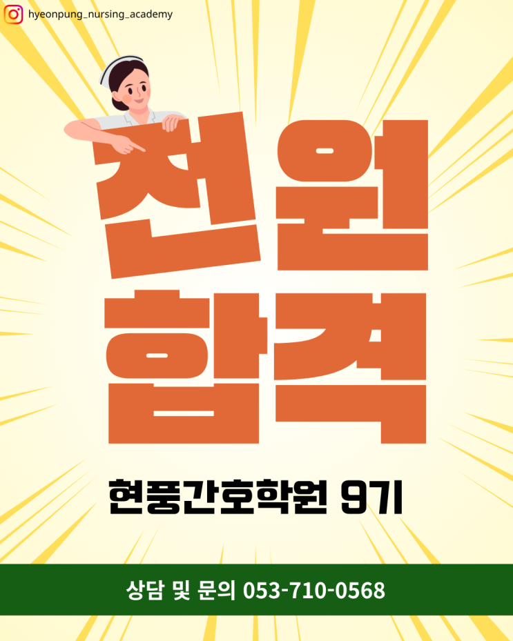 안녕하세요! 현풍간호학원입니다! 3월 끝자락 주말, 곳곳에 예쁜 벚꽃들이 늘어지게 피어있는데요. 다들 주말 벚꽃 나들이 예정 있으신가요? 오늘은 현풍간호학원의 중요한 소식을 들고 왔어요!! 바로바로! 9기 간호조무사 시험 합격자 발표 결과! 일단 결과부터 같이 볼까요!? 현풍간호학원 9기 수강생 37명 모두 ⭐전 원 합 격⭐ 했답니다! 이번 시험은 전국 합격률 87.2%로 CBT시험이 도입되고 문제 유형이 바뀌어서 낯선 문제가 많았다고 하는데요. 그래서인지 실제 수강생들이 시험을 치고 "어려웠다"라는 후기가 많았어요. 그럼에도 불구하고 현풍간호학원 9기 수강생들 모두 열심히 해주신 덕에 모두 높은 점수로 전.원.합....... <img src="https://blogthumb.pstatic.net/MjAyNjAzMjhfNzMg/MDAxNzc0NjgwMjk5MjY3.Z6eM6bo2Sp0ZRpajBlqBpw9HMo2ZUR-Nfa_K9LDti8Yg.8DI4B9fs6JqbCzQ4mQLhBsBz4BZfHrrHf9EUJghZja8g.PNG/14.png?type=s3" />
