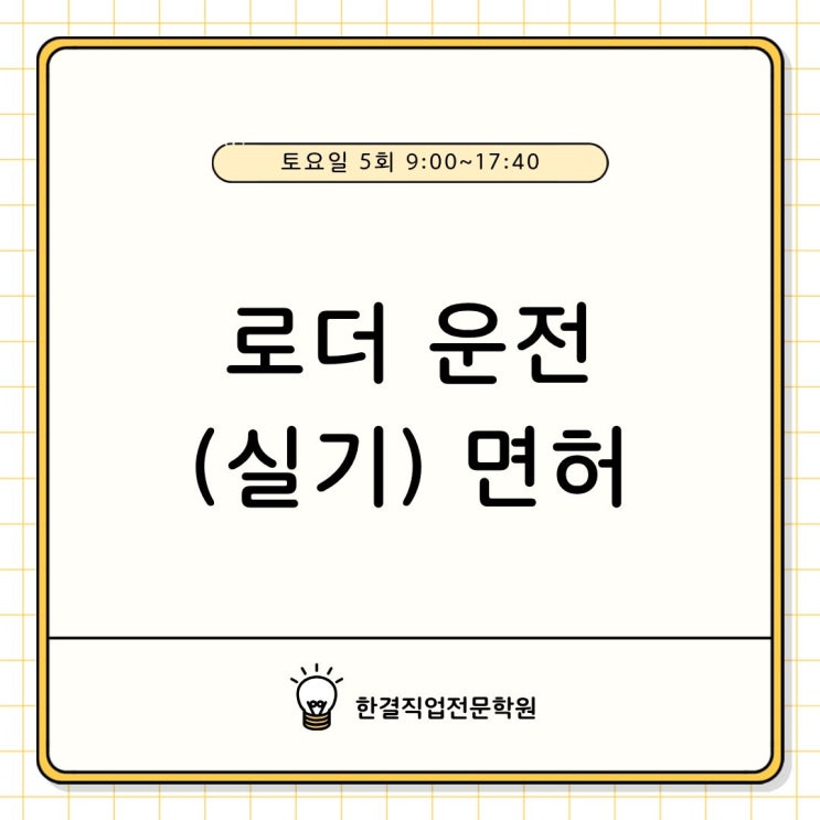 안녕하세요 ~!! 한결직업전문학원입니다. 오늘은 로더 운전(실기) 면허에 대해 소개하겠습니다 :) * 모집 인원 충원 시 조기 마감될 수 있습니다. 교육일정 1. 교육기간: 2026.01.31 ~ 2026.03.07 2. 교육시간, 요일: 9:00 ~ 17:40 [토요일] 3. 수강료: 428,140원 4. 본인 부담금: 272,420원 5. 정부 지원금: 155,720원 6. 모집인원: 10명 과정 소개 로더는 굴착, 성토, 정지용 건설기계로 토목공사, 광산 등에서 주로 이용되는 투사나 자갈 들을 트럭에 적재하거나 쓰인다. 기계 운전을 위해서는 특수한 기술을 필요로 하기 때문에 로더의 안전운행과 기계 수명 연장 및 작업능률제고를 위해서 산업현장에 필요한 숙련기능인력 양성이 요구된다....... <img src="https://blogthumb.pstatic.net/MjAyNTEyMzFfMjM1/MDAxNzY3MTUzNjk5MzA4.fjMQy8wb5hXYrt6kYOYVgE8x3bGrlGwhVcyJXK1hv94g.YKlMilyNP7YUTJXJMl-xD7Qc2ONiNmNY49AG-lUiELIg.JPEG/1.jpg?type=s3" />