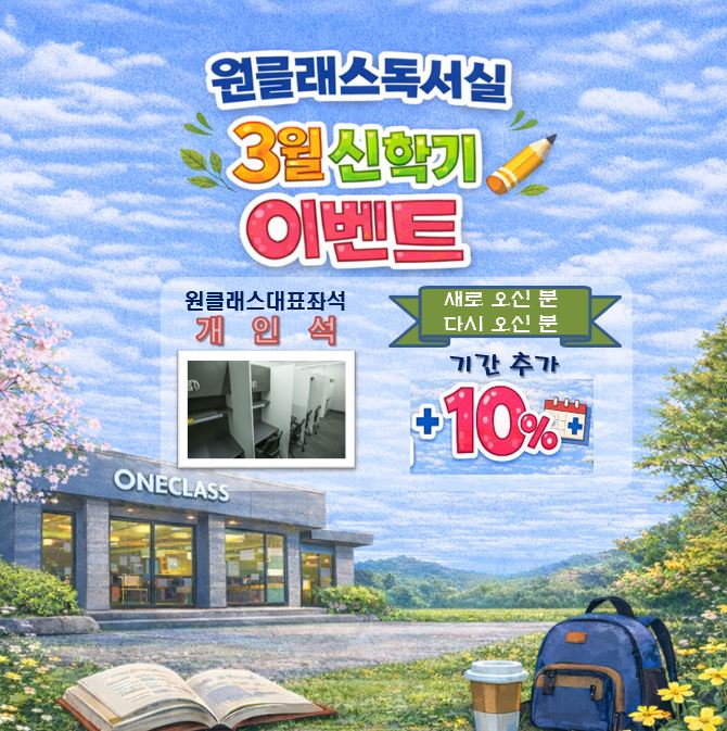 안녕하세요~ 늘 관리자가 상주하며 최상의 학습분위기를 유지하고, 집중도높은 자기주도 학습 공간을 제공하여 우리 지역 사회 청소년, 청년들의 꿈과 미래를 응원하는 원클래스독서실 구의점입니다. 새 학기가 시작되는 3월을 맞이하여, 원클래스독서실의 가장 많은 회원들이 이용해오신 원클래스 대표좌석 "개인석" 신규 회원 이벤트를 알려드립니다. ♥ 원클래스 독서실 3월 이벤트 ♥ ○ 혜택 : 개인석 신규 등록 회원 기간추가 10% ○ 대상 : 신규/재신규 정규 등록(1개월 단위) 회원 ○ 기간 : 26년 3월 1일 ~ 31일 ※ "개인석"이란? : 몰입도를 높여주는 170cm 높이 3면 칸막이 / 넉넉한 자체 사물함을 갖춘, 가장 많....... <img src="https://blogthumb.pstatic.net/MjAyNjAzMDJfMTA2/MDAxNzcyNDMwNzQ4MDYz.wBEN4qDBpZYNrkEmKg6NphePiRuIJEupoxFigCUXYCQg.HZ-u2FgIY6EZudfPYpPWUiyj6q6vKKVc58KTyin0ZKgg.JPEG/3%BF%F9%B0%B3%C0%CE%BC%AE%C0%CC%BA%A5%C6%AE%28%BB%E7%B0%A2%29.JPG?type=s3" />