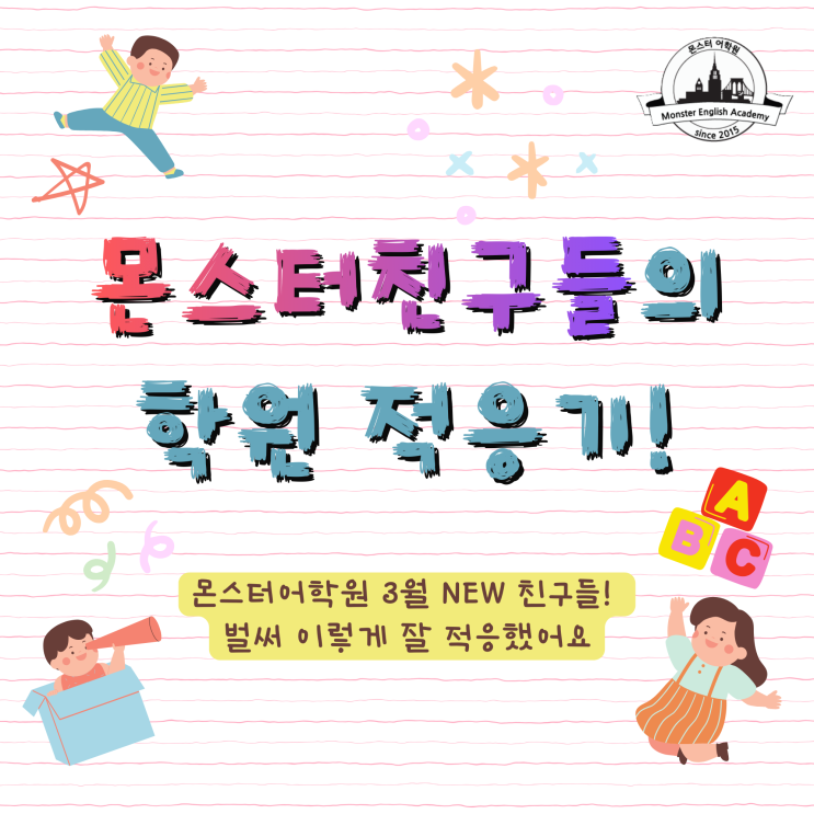 안녕하세요 광진영어학원 몬스터어학원입니다! ✨ 매해 3월이 되면 초등학교 입학과 함께 많은 부모님들께서 아이의 학원 생활을 고민하시게 됩니다. “우리 아이 잘 적응할 수 있을까?” “수업이 어렵지는 않을까?” “처음 가는 곳이라 힘들어하지 않을까?” 처음 학원을 보내는 부모님이라면 한 번쯤은 이런 걱정을 해보셨을 거예요. 하지만 몬스터어학원에 새로 입학한 3월 신규 친구들, 부모님의 걱정과 달리 훨씬 빠르게 학원 생활에 적응하고 있습니다! YAY!! 처음에는 조금 조용하던 친구들도 며칠 지나자 웃으며 수업에 참여하고 영어로 말해보고 친구들과 함께 활동하며 하루하루 몬스터 라이프에 익숙해지는 모습을 보여주....... <img src="https://blogthumb.pstatic.net/MjAyNjAzMTBfOSAg/MDAxNzczMTMwOTYxNjM4.3EXyqzzk2MfCWl0MPLtliCW396-M1JUUcgMzPxh6jHIg.iYiECT208YB0uGmb_QBEU4-ry2xXWIxmcsxJqq7qHdMg.PNG/Beige_and_Brown_Modern_India_Tour_and_Travel_Promotion_Instagram_Story.png?type=s3" />