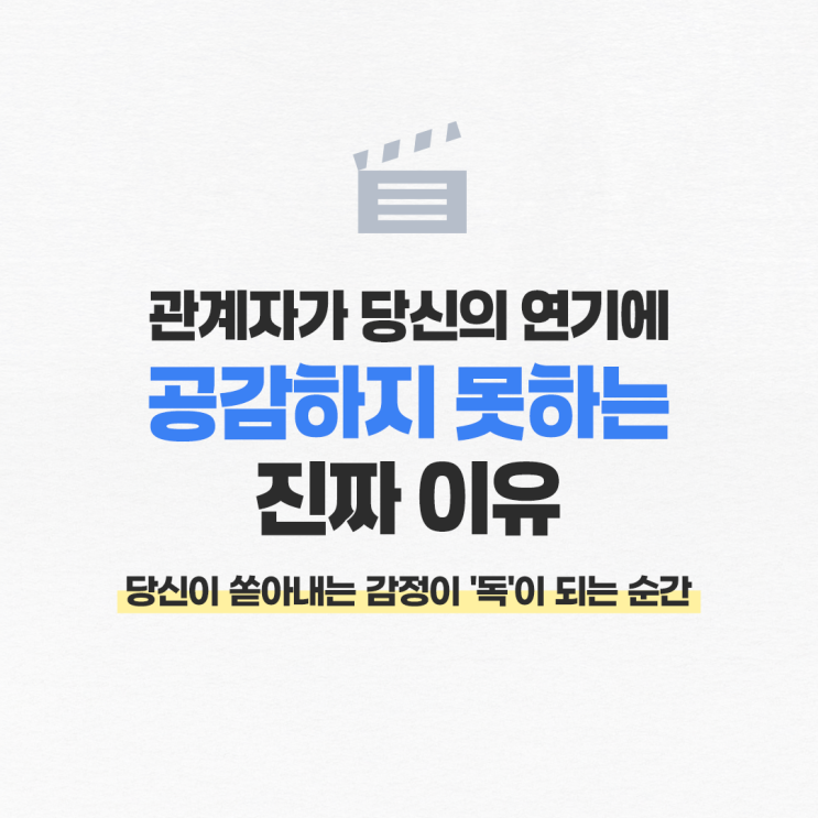 안녕하세요 엑터스 프로젝트 연기학원입니다! 내 열정이 오디션 현장에서 '독'이 되고 있다? "나 연기 이만큼 잘해!" 보여주기식의 과잉된 감정은 오히려 관계자의 공감을 튕겨냅니다. 혼자만의 '모노로그 쇼'는 이제 멈춰야 할 때! ♂️ 메릴 스트립이 말했듯, 연기는 나를 과시하는 기술이 아니라 '타인에 대한 깊은 공감'입니다. ✔️ 보여주고 싶은 욕망 버리기 ✔️ 인물의 심리적 트리거 관찰하기 ✔️ 인물이 선택할 행동 생각해보기 나를 봐달라고 소리치기보다, 관계자가 내 세계로 걸어 들어오게 만드세요! ✨ 더 쉽고 강력한 실전 연기 접근법이 궁금하다면? | 네이버 톡톡 클릭 ?....... <img src="https://blogthumb.pstatic.net/MjAyNjAzMTFfMTYg/MDAxNzczMjA5NjYxNTM4.c0IGe-2dCSRoZLvgbuhY5EBYV8ytnQbujMh_UV12SIwg.nnV0JeZUXb1E-SeX8rSuBNeaDbs6QzOYdWiXIJlYQScg.PNG/image.png?type=s3" />