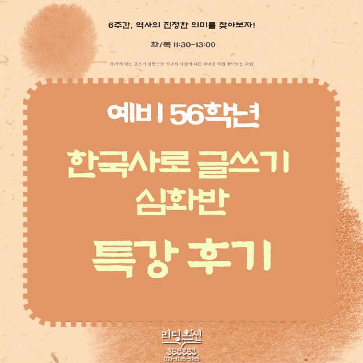 안녕하세요 ^^ 광장동 독서논술의 중심 리딩오션입니다. 오늘은 추운 날씨를 녹일 만큼 열정적이었던 <한국사로 글쓰기 심화반> 의 수업 후기를 가져왔습니다! 본 수업은 선사시대부터 대한민국의 이승만-박정희-전두환 정부까지의 역사적 흐름을 다루었습니다. 5학년 통사과목에 나오는 한국사의 예습과 복습에 초점을 맞춘 만큼 세부적인 정보까지 익히는 수업이었습니다. 교재는 푸른등대에서 나온 <손글씨로 정리한 한국사 노트 1,2> 를 사용하였습니다. 수업 내용 복습을 위한 워크북은 1권, 2권을 사용하여 실제 시험에서 자주 등장하는 지문을 살피고, 선지를 고를 수 있는 판단력을 기를 수 있었습니다! 무섭도록 열심히 선....... <img src="https://blogthumb.pstatic.net/MjAyNjAyMjZfMjM0/MDAxNzcyMDk5NzA5MTYw.i0aWGYru6NGDqJo-tlMLMIrmBbch24I7IQQiz9uaAzwg.oKqMZfSTGFRr2ps42UlZbR8r0MwWA1m86olVZMiIWI8g.PNG/%C0%BA%BF%B5%BD%DC_%B9%E6%C7%D0%C6%AF%B0%AD-%C7%D1%B1%B9%BB%E7-%C0%CE%BD%BA%C5%B8%B1%D7%B7%A5-%BD%E6%B3%D7%C0%CF-003.png?type=s3" />
