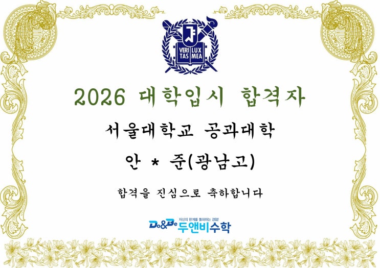 ※ 수시 및 정시합격생들을 게시하였으며 예비번호 부여받은 학생들이 합격하면 추가로 게시할 예정입니다.(학생들 요청에 따라 합격증을 첨부하지 못한 경우도 있습니다.) #자양동학원 #영어종결자학원 #자양중영어 #신양중영어 #자양고영어 #건대부고영어 #건대부중영어 #광양중영어 #광양고영어 <img src="https://blogthumb.pstatic.net/MjAyNjAyMDlfMjM0/MDAxNzcwNjM2NTEzNzQy.wv31fyRJhP93XSOcdUv6lFckJBYCvnZRh24xEN_UZGMg.gHj2lYyG5NEqtL2DC2iu9VMpGa2Xr_Xc0dVN2ioDNFAg.JPEG/900%A3%DF1000006269%A3%DF496121972522102.jpg?type=s3" />
