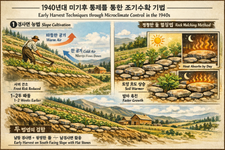 안녕하세요^^중곡동 영어 유톡영어 친구들과 블로그님들 다소 딱딱한 주제일지 모르나 추운지방에서 미기후를 활용해서 기온조정이라는 -'cheated God'하나님을 속여 인간을 이롭게 했다는- 다소 흥미로운 주제인 것 같아 기록해봅니다 (수능특강책에는 1940년대 사례가 나와 저도 그사례 중심으로) ● 1940년대 미기후 통제를 통한 조기수확 기법 Early Harvest Techniques through Microclimate Control in the 1940s 1.경사면 이용 (Slope Cultivation) 사례 지역: 밴쿠버 (1940년대) Case Region: Vancouver, British Columbia, Canada (1940s) 남향 경사면은 태양빛을 더 오래 직접적으로 받는다. → South-facing slopes receive....... <img src="https://blogthumb.pstatic.net/MjAyNjAyMjZfMzAw/MDAxNzcyMDY4NjkyMDYz.4wJoyxWDlx7iFDg7TQ2qdE78bQPtBkfwlOi1-6Dw4_sg.h7p_j3YAiFNd8qlZv2UdndpaVZVnN5CTEdJv8YMRAyog.PNG/900%A3%DFfile%A3%DF000000004f447209b65c1c67fe4dbdd2.png?type=s3" />