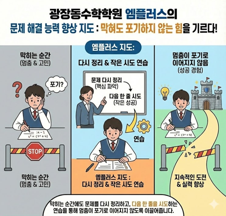 안녕하세요. 광장동수학학원 엠플러스입니다✨ 수학 문제를 풀다가 중간에 손을 놓아버리는 아이들이 있습니다. 처음부터 안 하려는 게 아니라 분명히 문제를 읽고 시작은 했는데, 어느 순간 멈추고 더 이상 진행하지 않는 경우입니다. 부모 입장에서는 “조금만 더 생각해보면 되는데 왜 포기할까”라는 답답함이 생길 수 있습니다. 하지만 이 행동은 의지 부족이나 집중력 문제라기보다 문제에 막혔을 때의 반응 패턴에서 비롯되는 경우가 많습니다. 광장동수학학원 엠플러스에서도 수학이 약해지는 아이들을 살펴보면 실력보다 먼저 ‘포기하는 순간의 습관’이 굳어 있는 경우를 자주 보게 됩니다. 막히는 순간, 바로 손을 멈춰버립니다 문제....... <img src="https://blogthumb.pstatic.net/MjAyNjAyMjBfMTI5/MDAxNzcxNTUwMDE1NzI2.iUmeorhTiKukSNXaCBFG3lhOH-w7Uwdztnc7mnGHvUwg.6DpbWymjiRCc4LU-pstCkUaVBSR1hblrmef_igjjKqQg.JPEG/unnamed.jpg?type=s3" />