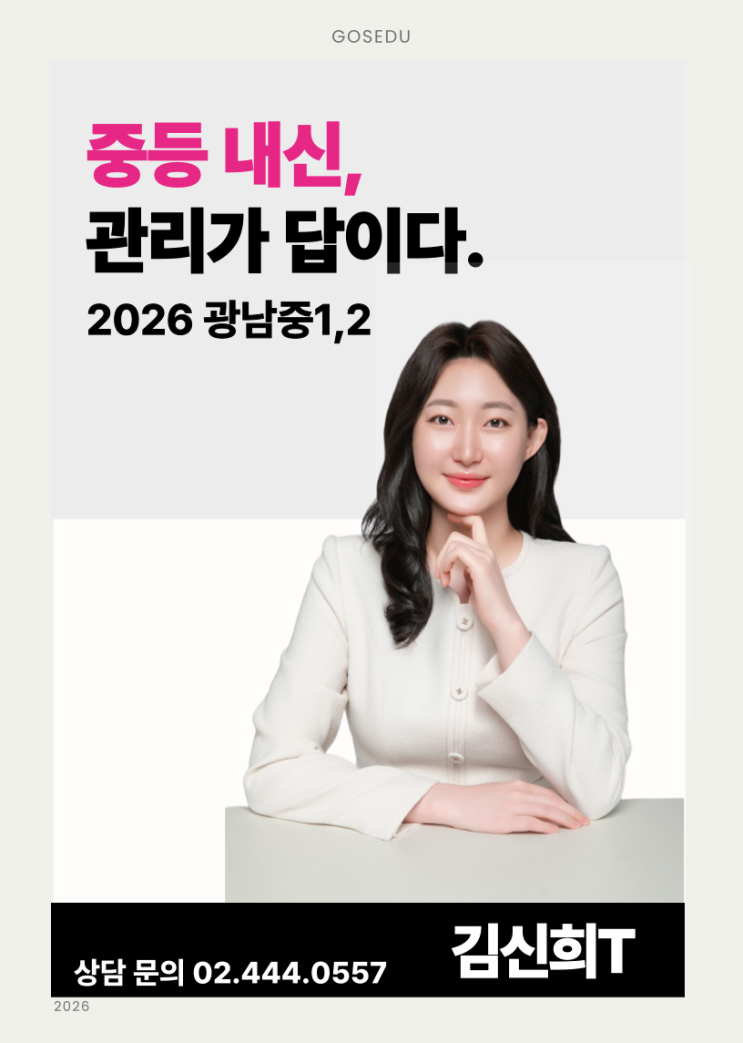 안녕하세요. 광진GOS 국어전문학원 김신희 강사입니다. 2026학년도 광남중 맞춤 내신 수업을 준비했습니다. 광남중 맞춤 교재 제작 학교 출제 구조 분석 개인별 맞춤 지도 시험전까지 지속적인 관리 <성적 향상의 절대 공식> ★학생: 성적 향상의 주체 + ★학부모: 신뢰와 서포트 + ★강사: 책임감과 완벽한 가이드 제공 기출 중심 클리닉 반복 훈련 학습 이탈 방지 성적은 만들어지는 결과입니다. 학생의 스케줄을 배려하는 클리닉 수/목/금 선택형 1:1 맞춤 피드백 제공 게다가 무제한 질문!!! 상담 및 문의 사항은 학원으로 연락주세요. 상담 문의 : 02-444-0557 #광진구국어학원#고스국어#광진고스에듀#고스국어광진#광진구국어전문학....... <img src="https://blogthumb.pstatic.net/MjAyNjAyMjZfMjY5/MDAxNzcyMDkxODI1Njc0.i3lENTG-cqWzeNANnLf5iYwJ0I0yjtyWv1K0iMGGztog.T-_4iG4XJxFAODaytrdzsnGjQM-hHJi5OgyL0rpotDcg.PNG/%B1%A4%B3%B2%BA%ED%B7%CE%B1%D7_%C7%A5%C1%F6_%C3%D6%C1%BE.png?type=s3" />