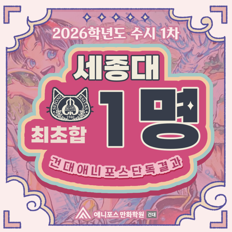 안녕하세요, 건대 애니포스입니다. 건국대 합격자에 이어서 이번에는 저희 학원과 가장 가까운 대학교 세종대 합격자입니다! 세종대의 만화애니메이션텍 전공은 성적에 면접에 드로잉테스트까지 있어서 준비하기도 상당히 까다로운데요. 세종대학교에 합격한 건대애니포스 학생이 누구일지 궁금하시다면~ 2026학년도 세종대 수시 1차 최초 합격자 건대애니포스 단독결과 발표! ✨지금 시작합니다✨ 2026학년도 세종대 수시 1차 최초 합격생 1명! 건대 애니포스 단독결과 2026학년도 세종대 수시 1차 최초 합격생 창의소프트학부-만화애니메이션텍전공 1명 <총 1명> 최초 합격! 건대 애니포스 학생들의 합격을 진심으로 축하드....... <img src="https://blogthumb.pstatic.net/MjAyNTEyMTNfMTYx/MDAxNzY1NTk2ODE5NDMy.NG6TH0ShxKf8wGTfKfvYMojEEJ1L5lO7smRMNECp5Vkg.x6VwwE-qayLnZ7ayCcBWfnf3H2gbqln6Ne0iEQygIfEg.PNG/1765596640979.png?type=s3" />