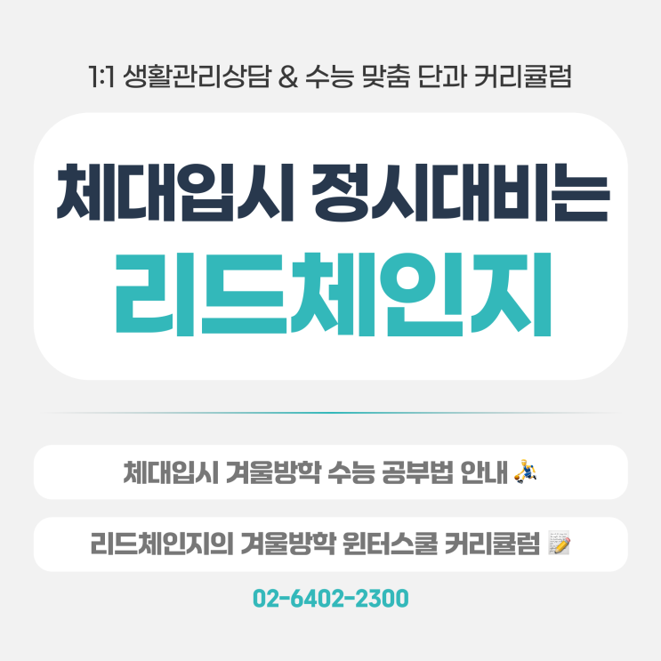 안녕하세요! #2026수능 #2027수능 #수능대비 #정시대비 #광진구정시학원 #광진구수능학원 #광진구학원 #강동구정시학원 #강동구수능학원 #강동구학원 #군자역정시학원 #군자역수능학원 #수능국어 #수능영어 #예체능정시 #예체능수능대비 #체대입시수능준비 #체대정시 #체대실기 #예비고3 #예비고3공부법 #겨울방학공부법 #겨울방학 #방학특강 #겨울방학특강 #수능특강 #수능준비 리드체인지 수능전문학원입니다:) 찬바람이 매서워지고, 어느덧 12월의 끝자락에 다다랐습니다. 달력이 넘어가며 “이제 정말 2026년이다”라는 말이 체감이 아닌 현실로 다가오는 시기입니다. 수험생에게 이 시기는 단순한 연말이나 휴식의 시간이 아니라, 앞으로의....... <img src="https://blogthumb.pstatic.net/MjAyNTEyMTdfMjAg/MDAxNzY1OTY5NDU2Nzky.cnQMuJzRuHRyRWWOFhCWck4ZYN26XfcLyL6LByE6YIMg.5nzIWSlzEj_DYi4DJs1hP1Vgkf8FTZbXPWmaq6LH00Ug.PNG/878068.png?type=s3" />