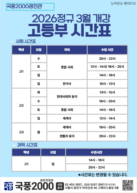 2026 정규 3월 개강 시간표 안내 중·고등부 학년별 수업 시간표가 나왔습니다. 새학기 대비, 미리 준비하는 수업으로 내신과 학습 흐름을 안정적으로 잡아드립니다. ✔ 과목별 전문 수업 ✔ 학년별 맞춤 시간표 ✔ 체계적인 관리 시스템 궁금하신 점은 언제든지 문의 주세요. 준비된 새학기 ,결과는 다름니다. <img src="https://blogthumb.pstatic.net/MjAyNjAyMDhfMzEg/MDAxNzcwNTM2Njk5NDAz.Dnt3Du40f_T_jbn6riStHoi-vjZVLkjrVTBlKOT1uq4g.DOIEUAxw92gzQVZZFir5I0O6OLzwB20_I04Ups_sEegg.JPEG/20260208_164013.jpg?type=s3" />