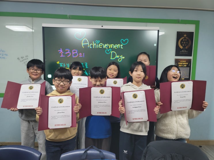 안녕하세요, 학부모님 및 학생 여러분! 군자동 장안초앞에 위치한 SKY영어수학학원 원장 제이티철입니다. 귀욤둥이 초3B 아이들의 Achievement Day (비욘드 파닉스 수료식과 파티 현장)를 공개해드리겠습니다.. 약1년동안 파닉스를 공부를 하면서 정말 많이 성장한 아이들에게 폭풍칭찬과 함께 수료증을 전달을 했습니다, 아이들이 수료증을 받으면서 뿌듯해하는 모습이 아주 보기 좋더라구요. 스카이영어학원에서는 그동안 공부하느라 고생한 우리 스카이 키즈들 이날은 맛난거 먹고 노느라 신이 났네요 ㅎㅎ 아이들이 아침도 안먹고 이거 먹으려고 기다렸다면서 전~~~부 다 먹을것이라고 호언장담을 하더라구요. 그래서 정말 많이 시켜줬거든요....... <img src="https://blogthumb.pstatic.net/MjAyNjAyMDlfMTgw/MDAxNzcwNjExMDIyNzUz.eSrZli-9nUowC8d51AJqLHr6JF6sLVSEa3xv_7sZ8w8g.g0gtm0obVEb70KEGfonFW6AmKLZP4f_w9utg4X20JZAg.JPEG/KakaoTalk_20260202_162548626_25.jpg?type=s3" />