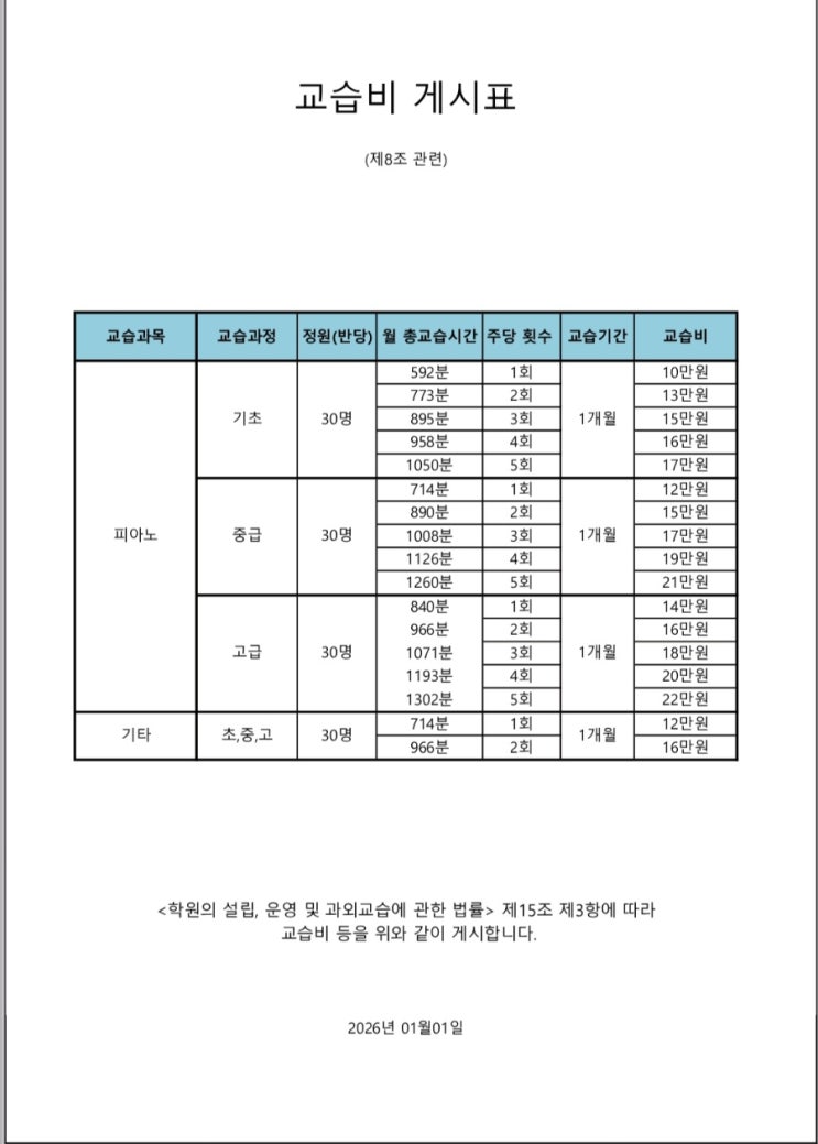 [공지] 이화이레음악학원 교습비 안내