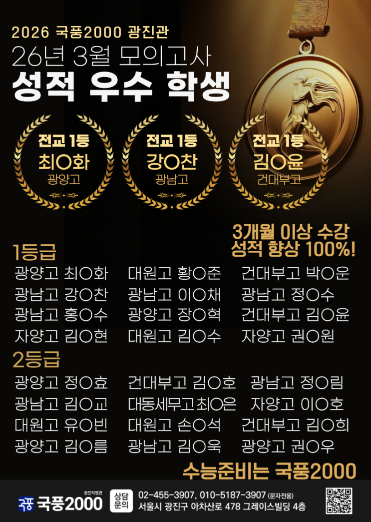 <2026년 3월 모의고사 성적 우수자 안내> 2026년 3월 24일 전국 단위 모의고사가 실시되었습니다. 이번 평가는 학생들의 현재 수준뿐 아니라, 학습 방향과 향후 성취 가능성을 확인할 수 있는 시험이었습니다. ▣ 2026년 3월 모의고사 국어 분석 이번 시험은 단순한 문제 풀이 능력이 아닌, 독해력의 구조적 이해를 중심으로 출제되었습니다. ■ 독서 영역 난이도 상승 개념간 관계를 파악하는 문제 비중 확대 단순 정보 확인 중심 접근으로는 해결이 어려운 유형 출제 ■ 선택지 판단의 정밀도 요구 유사한 정답간 구분을 요구하는 문제 증가 명확한 기준이 없는 경우 오답 가능성 증가 ■ 시간 관리 요소 강화 지문 길이 및 사고량 증가....... <img src="https://blogthumb.pstatic.net/MjAyNjA0MDJfNTgg/MDAxNzc1MDk3MDAzMjkw.nI-UqYUX0TVhGVfGPESBa4hz0GZf5rcEzSKRjJI3zeIg.vwFgTHcT31RRDlULOO9EzyJRMtYZsJ92xVPMYw4Kfxog.PNG/26%B3%E2_3%BF%F9_%B8%F0%C0%C7%B0%ED%BB%E7-_%BA%B9%BB%E7%BA%BB.png?type=s3" />