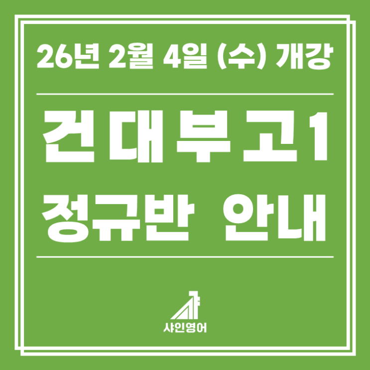 안녕하세요, SHINE makes you shine! 샤인영어입니다. 2026년 건대부고 1학년 정규반이 2월 4일 (수)에 개강됩니다. 고등부 정규반은 주 1회, 4시간 수업으로 진행되며, 내신 기간에는 클리닉이 별도로 진행됩니다. 건대부고는 선택형(객관식)이 80점, 서답형이 20점 출제되어 서답형에 대한 부담이 적어 보일 수 있습니다. 하지만 선택형이 35문항 내외로 문항수가 매우 많아 시간 관리가 쉽지 않으며, 시간 부족으로 문항을 다 못 푸는 경우도 발생합니다. 선택형은 대체로 수능 영어의 유형과 유사하며 선택형 후반부에 어휘 관련 문항이 집중적으로 출제되는 것도 건대부고 영어 출제 경향 중 하나입니다. 건대부고 25년 1학년 1학기 직후 중....... <img src="https://blogthumb.pstatic.net/MjAyNjAxMjlfMjQ4/MDAxNzY5Njg2NDA1MzE4.AUKH_9hXU9UqfwHivaW18PI_wYhGdm-fbK3HcBFfS1Eg.56KmqQX8H3gIg7uhEqgpddFRDH8B-29XWmYV3e6iAE4g.PNG/%B0%C7%B4%EB%BA%CE%B0%ED1.png?type=s3" />