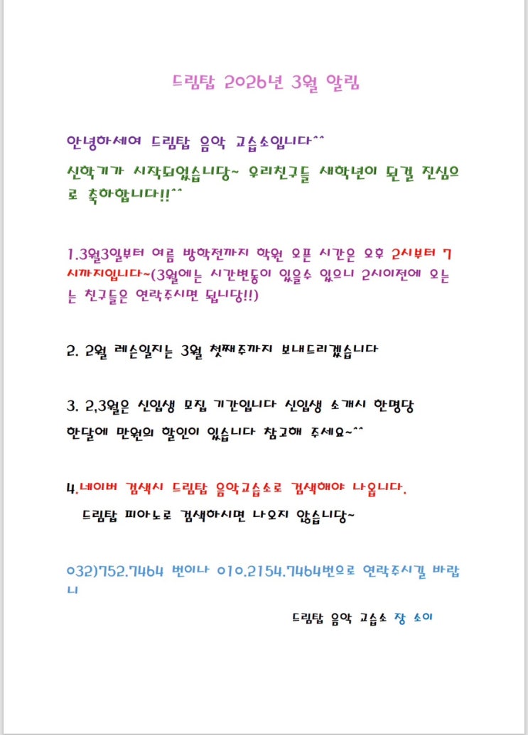 2026년 3월 신학기가 시작되었습니다!! 한학년씩 올라가는 우리 친구들 모두 축하하구 모두 응원해!! 3월 알림입니다!!~~^^ #3월알림 #드림탑피아노_3월소식 #드림탑피아노 #드림탑음악교습소 #드림탑음악 <img src="https://blogthumb.pstatic.net/MjAyNjAyMjhfMTUg/MDAxNzcyMjc4MzE4MTA1.l_gwipjqwfZxmhDd-9fuEQPXLmLTIoqXhv8D069JAlEg.68lsj93Sjs7F_RGkJZMKom8RewqnFfnYS6wVYwlMJi4g.JPEG/IMG%A3%DF2113.jpg?type=s3" />