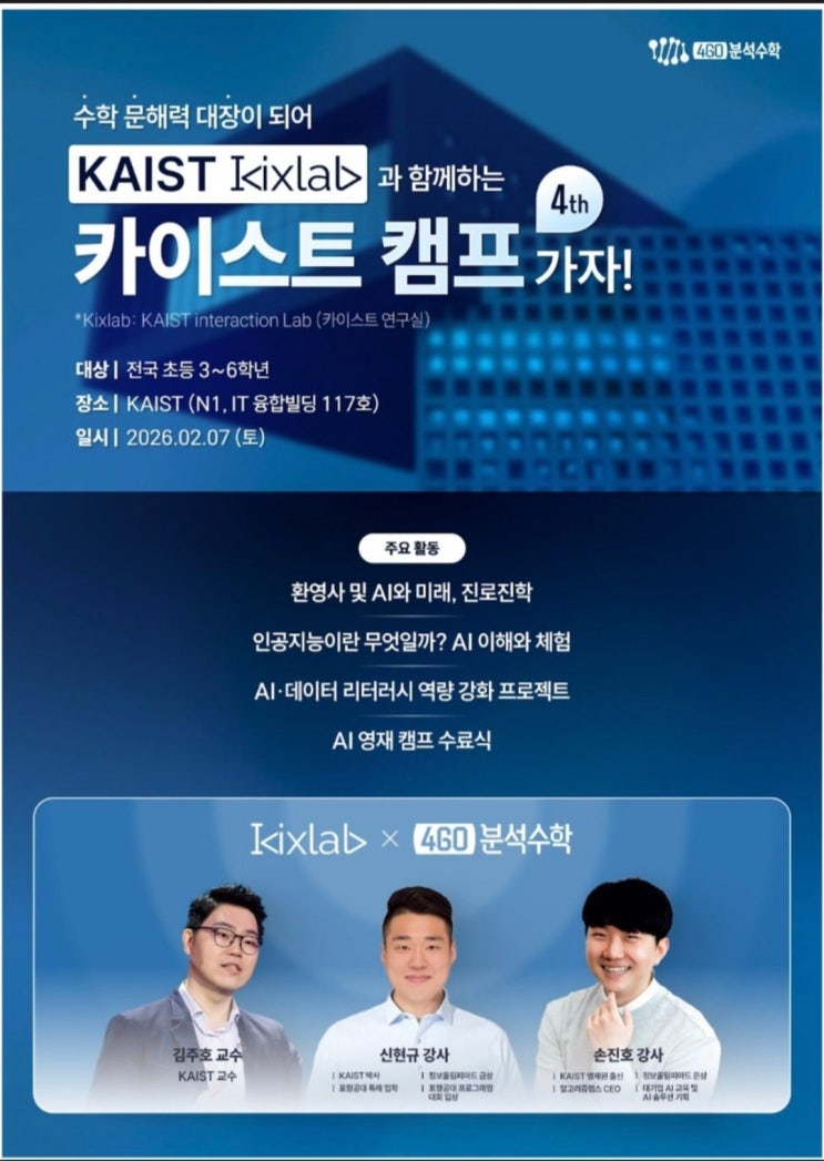 KAIST에서 펼쳐진 특별한 하루 인공지능과 수학적 사고가 만난 캠프 이야기 안녕하세요 오늘은 우리 학원의 자랑스러운 세 명의 학생들이 대전의 명문 이공계 대학, 한국과학기술원(KAIST) 에서 열린 특별 캠프에 참가한 이야기를 전해드리려고 합니다. 인공지능을 활용한 수학적 사고 활동 이번 캠프의 핵심 주제는 “인공지능을 활용한 수학적 사고 확장” 이었습니다. 학생들은 단순히 문제를 푸는 것을 넘어, AI가 어떻게 데이터를 분석하고 패턴을 찾으며 논리적으로 결론에 도달하는지를 직접 체험했습니다. ✔️ 수학적 추론 과정 분석 ✔️ 알고리즘적 사고 이해 ✔️ 문제 해결 과정을 구조화하는 활동 특히 인상 깊었던....... <img src="https://blogthumb.pstatic.net/MjAyNjAyMTlfMTA0/MDAxNzcxNDg2ODAzMDEw.mIqVmluIUvzUhP77dU7U0eVp5pQTVDzN4gPPxD9wCkYg._PV3poRiRZqcF0cg5yveuUE6yxFE3Ond1E2ksAb1-M0g.JPEG/KakaoTalk_20260219_162049795_03.jpg?type=s3" />