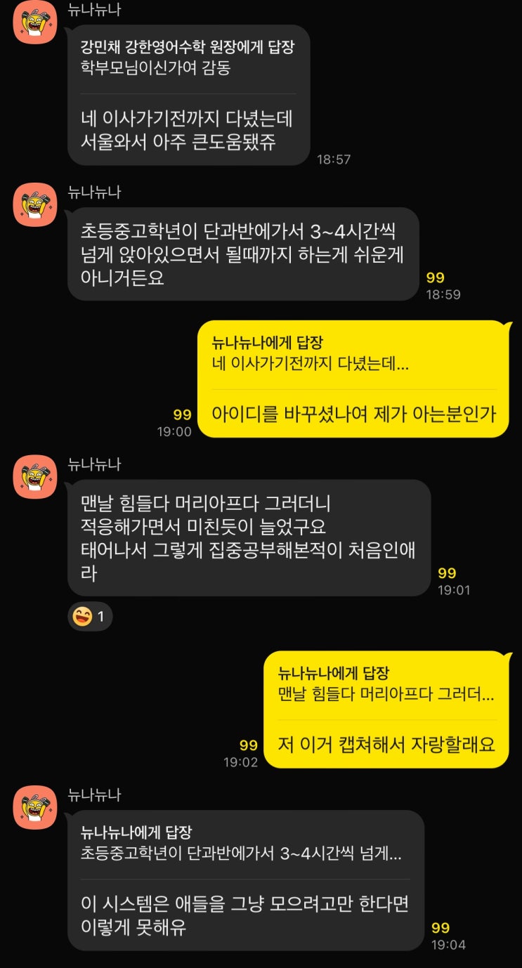 영종 지역 단톡방에 올라온 강한영어수학의 칭찬