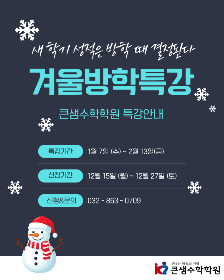 안녕하세요. [용현동수학학원] 큰샘수학학원 2026 겨울방학특강 안내입니다. 새 학기의 성적은 방학 때 결정됩니다. 겨울방학 동안 한 단계 확실하게 올라가고 싶은 친구들을 위한 [용현동수학학원] 큰샘수학학원 겨울방학특강 모집 안내입니다. ❄ 특강기간 1월 7일(수) ~ 2월 13일(금) ❄ 신청기간 12월 15일(월) ~ 12월 27일(토) ❄ 신청 & 문의 032-863-0709 * 2학기 기말고사기간 종료 후 특강안내문 발송예정입니다. * 인기가 많은 강좌는 조기마감 될 수 있습니다. 이번 겨울에는 개념을 다지고, 약한 부분을 확실히 잡고, 새 학기엔 더 가볍게 출발해요. 학생들이 스스로 성장했다고 느낄 수 있는 겨울을 함께 만들겠습니다. <img src="https://blogthumb.pstatic.net/MjAyNTEyMDhfODcg/MDAxNzY1MTgxNTc2NzU3.FwYi_kuctzNJncOGRboIDftCp0oFRF98X3mBDR-vhJMg.qjEwQRlf-uw6FGeABmHVEWRKNkg2i985zwDFGpywIo0g.PNG/1.png?type=s3" />