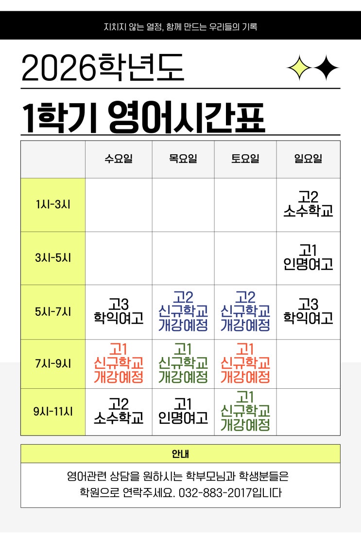 안녕하세요^^ 3월 9일 새로운 영어 시간표 소개합니다. 그동안 새로 개강하는 영어수업에 대한 문의가 많았습니다. 영어선생님 일정을 고려해서 신규반 개강이 미뤄지고 있었는데요 드디어 신규반을 개강하기로 했습니다. 2학년 1반, 1학년 2반 모두 3반을 개강 예정입니다. 최대정원 6명, 같은학교 수업(소수학교는 합반 수업)입니다. 상담을 원하신다면 학원으로 전화주세요. 상담일정을 잡고 방문하시면 됩니다. <img src="https://blogthumb.pstatic.net/MjAyNjAzMDlfMTAg/MDAxNzczMDM1NTM5ODY1.rCaUZgDF3xvzCCyHZbp0M3C9C2FaHC7OtPShJ5Nw6Q8g.Bib_bfvqtG1o_2aJN1ETiJh_z_iTG67UaaXwuzcimY4g.JPEG/%BF%B5%BE%EE%BD%C3%B0%A3%C7%A5.jpg?type=s3" />