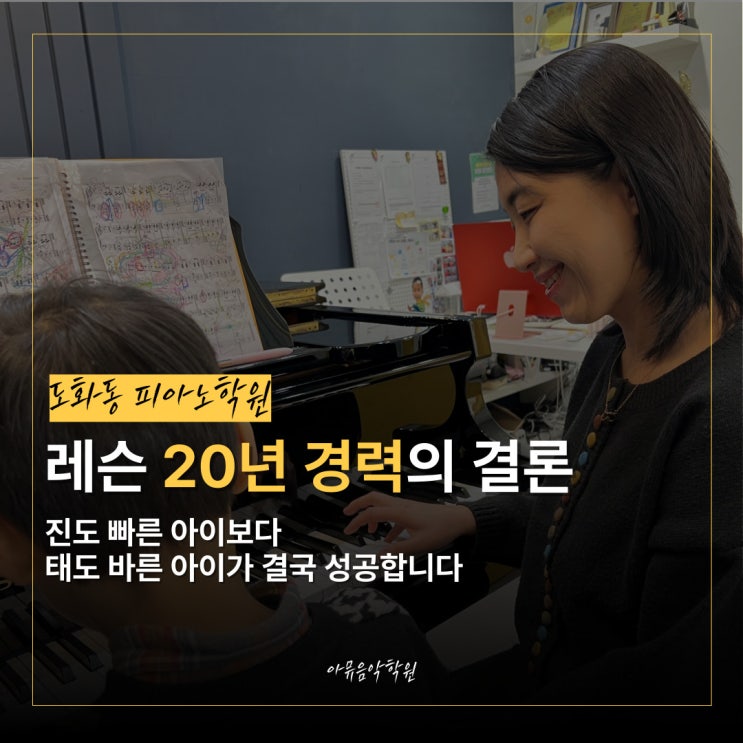 "옆집 애는 벌써 체르니인데, 우리 애는 왜 아직 바이엘인가요?" 안녕하세요. 도화동음악학원 아뮤 윤혜영원장입니다. 인천 미추홀구 도화동에서 학부모님들을 만나 상담하다 보면 이런 조급함 섞인 목소리를 참 자주 듣게 되죠 단순히 책장을 빨리 넘기는 '속도'에 매몰되어, 정작 입시와 학업 성공의 핵심인 '몰입의 태도'를 놓치고 계시지는 않나요? 숙명여대 대학원 석사 출신의 제가 수천 명의 아이를 마주하며 내린 결론은 명확해요. 피아노는 단순히 건반을 누르는 기술이 아니라, 악보라는 난관을 대하는 '태도'를 설계하는 과정이어야 합니다. 기초가 부실한 채 진도만 뺀 아이들은 조금만 어....... <img src="https://blogthumb.pstatic.net/MjAyNjAyMjNfMTQx/MDAxNzcxODMzMDYyMTY3.TENrf5sYNETI8fV6vr6362O--yYPAR93VBQ6DLl_HhAg.f_q3Nbn4QwqmfJ9kKBK9S0HqaZLt43qmIFUYXXh9rpkg.JPEG/1.jpg?type=s3" />