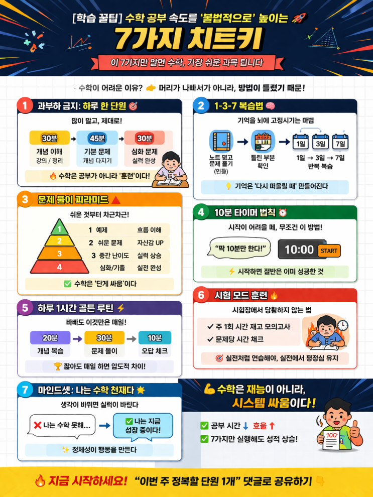 수학 공부 속도를 ‘합법적으로’ 높이는 7가지 치트키 수학이 어려운 이유는 머리가 나빠서가 아닙니다. 방법이 틀렸기 때문입니다. 지금부터 알려드리는 7가지만 제대로 실행하면 수학은 “가장 쉬운 과목”이 됩니다. 1. 과부하 금지: 하루 한 단원만 많이 하는 게 아니라 제대로 하는 게 핵심 ✔ 추천 루틴 (총 1시간 45분) 30분 → 개념 이해 (강의 / 교재 / 정리) 45분 → 기본 문제 풀이 30분 → 심화 문제 도전 핵심 수학은 공부가 아니라 훈련이다 2. 1-3-7 복습법 (기억 고정 시스템) 한 번 공부하고 끝? 절대 기억 안 남습니다 ✔ 이렇게 하세요 노트 덮고 문제 풀기 (인출) 틀린 부분 확인 1일 →....... <img src="https://blogthumb.pstatic.net/MjAyNjAzMjRfMTUz/MDAxNzc0MzU5MjgwMzcz.Dx_tdw1h1-6V4Q2-_4ui1LcnjQynwe9rDZHeLG-4IvUg.jdnNWMeGW4EkJEQktoKrYYLK3S3FVZldY1S1eGBUEdkg.PNG/%BC%F6%C7%D0_%B0%F8%BA%CE_%BC%D3%B5%B5%B8%A6_%BA%D2%B9%FD%C0%FB%C0%B8%B7%CE_%B3%F4%C0%CC%B4%C2_7%B0%A1%C1%F6_%C4%A1%C6%AE%C5%B0.png?type=s3" />