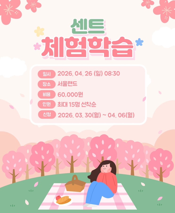 센트음악학원 체험학습 안내 안녕하세요 :) 센트음악학원입니다❤️ 따뜻한 봄을 맞아 아이들과 함께 즐거운 추억을 만들기 위해 특별한 체험학습을 준비했습니다 이번 체험학습은 아이들이 정말 좋아하는 서울랜드에서 진행됩니다! 친구들과 함께 신나게 뛰어놀며 스트레스도 풀고, 평소 학원에서는 경험하기 어려운 소중한 시간을 보낼 예정이에요 체험학습 안내 ✔️ 일시 : 2026년 4월 26일 (일) 오전 8시 30분 ✔️ 장소 : 서울랜드 ✔️ 비용 : 60,000원 ✔️ 인원 : 최대 15명 (선착순 마감) ✔️ 신청기간 : 2026년 3월 30일 ~ 4월 6일 소규모 인원으로 진행하여 아이들 한 명 한 명 더욱 꼼꼼하게 케어할....... <img src="https://blogthumb.pstatic.net/MjAyNjAzMzBfOTcg/MDAxNzc0ODc4NDkxNzMz.BbK3EHu0MZb7UnNsba65z9O3xc7eeZtnJ0453ssQJuog.kBaWfYeKwePAR4xLKxkI7hc4jVvIwmMWPfsAxLT7IX4g.JPEG/output%A3%DF3988680389.jpg?type=s3" />
