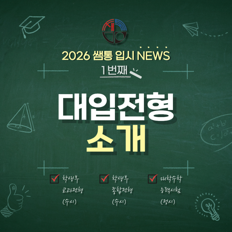안녕하세요. 인천 용현동에 위치한 수학 과학 전문학원 ' 쌤과 통하는 학원 ' 입니다. 드디어 2026년의 해가 밝았습니다! 중학생에서 고등학생으로 올라가는 우리 예비 고1들, 본격적으로 대학교 진학을 위해 달릴 때가 온거죠! 여러분 모두 마음 속에 서울대, 연세대, 고려대 한 번 쯤 품어본 적 있으시죠? 그렇다면 좋은 대학을 가기 위해서 단순히 고등학교 성적만 잘 받는 방법 밖에 없을까요? 대학을 가기 위한 방법은 상당히 여러가지가 있습니다. 대학 전형은 세세하게 따지면 상당히 많습니다. 반영하는 과목, 반영비율, 수능 최저 등급 기준 등등 대학교마다 수치가 다르고, 이름도 다르며, 특별 전형 (농어촌거주, 기초생활....... <img src="https://blogthumb.pstatic.net/MjAyNjAxMDlfMjk1/MDAxNzY3OTY0MzAzNzcz.SFZT0HfZi60iztaHpHG1NEQpfgRXZtDt4iuwlhmnUiog.HSO4d1Ev_-XKCHkG6aNEIaYOHMjQqHCEDvGYItX0cEwg.PNG/2026%C0%D4%BD%C3%B4%BA%BD%BA.png?type=s3" />