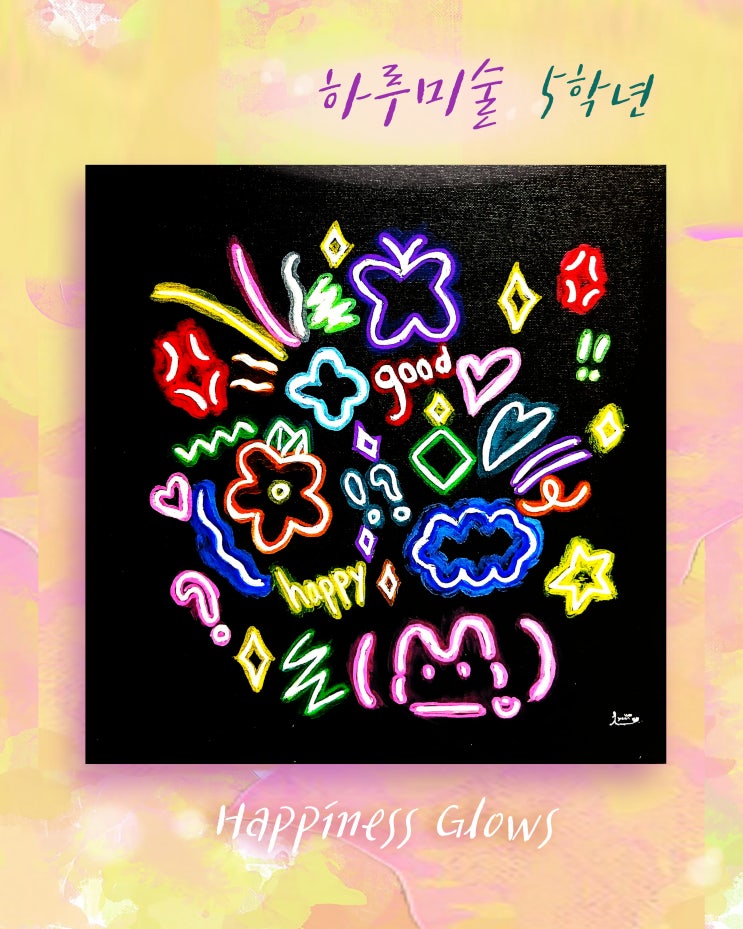 안녕하세요, 하루미술입니다! 주안 더월드스테이트 상가(최앤박소아과 옆)에 위치한 미술학원입니다. 오늘은 경원초등학교 5학년 학생의 미술작품! 아주 특별한 아크릴화 작품을 소개해 드리려고 합니다. 이번 작품은 검정색 배경 위에서 다양한 빛깔이 어우러지고 있어요~ 마치 네온사인처럼 반짝반짝 빛이나죠~ 검은 캔버스 위에는 보랏빛 나비, 하늘빛 네잎클로버, 분홍빛 캐릭터, 그리고 ‘good’, ‘happy’, 와 같은 단어들이 자유롭게 자리하고 있습니다. 어두운 배경 위에서 하나하나의 색이 선명하게 떠올라 마치 밤하늘 속 빛으로 표현된 아이의 생각과 감정이 반짝이는 듯해요~ 검은 배경 위에서 피어난 빛 보통 흰색 바탕....... <img src="https://blogthumb.pstatic.net/MjAyNTExMTNfMjg4/MDAxNzYzMDA0Mjg5NzQx.dC2BNNpo-mXKVnC2RJP2Jxt5lPVhfKk3hrFuD4uuMlAg.BEBrbpz-nmCmMFmROLOR8WsCDpm98u5KKzl5dvv5Jaog.JPEG/%B4%F5%BF%F9%B5%E5%BD%BA%C5%D7%C0%CC%C6%AE_5%C7%D0%B3%E2_%B9%CC%BC%FA%BF%CF%BC%BA%C0%DB%C7%B0.jpg?type=s3" />
