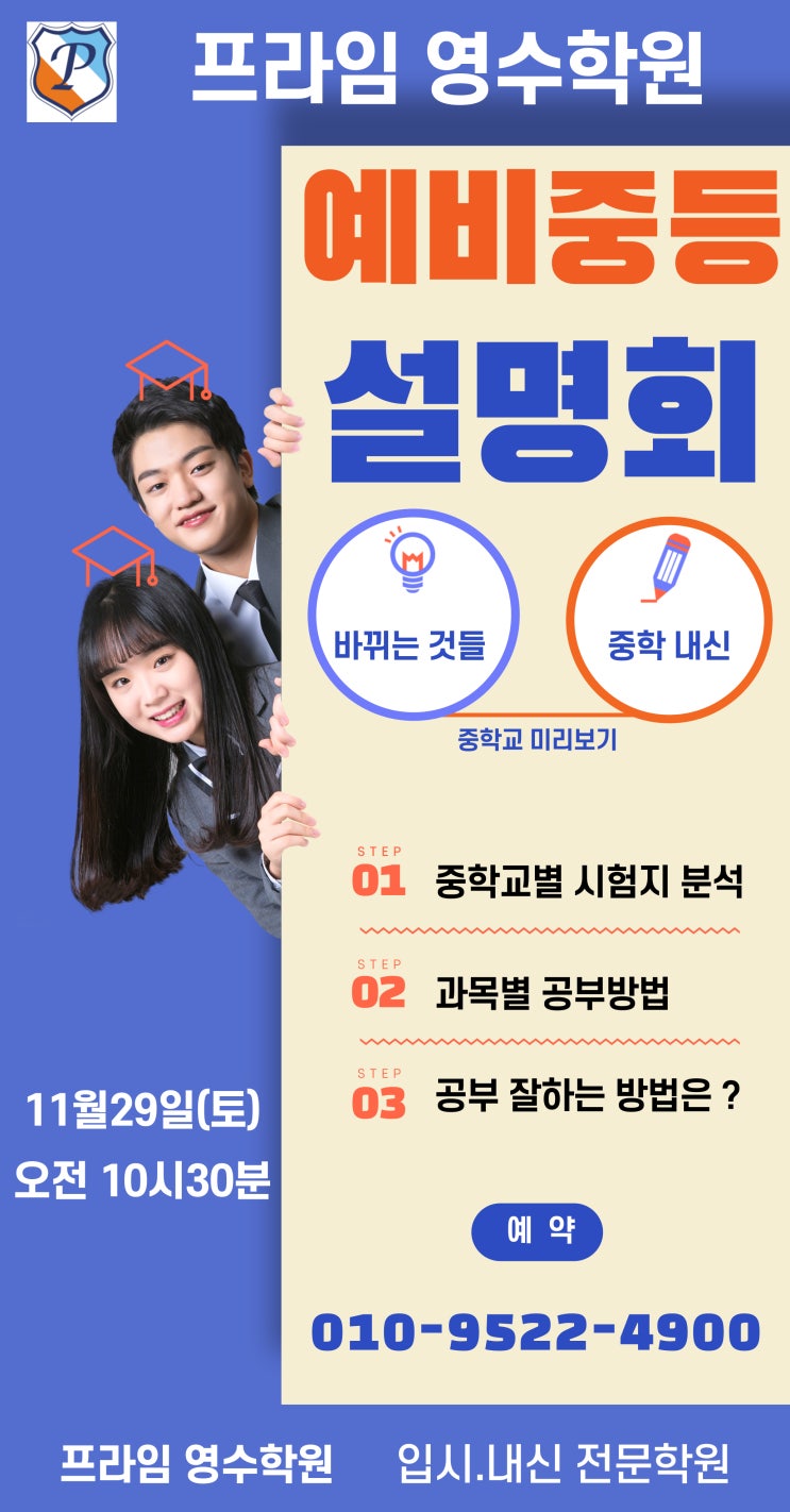 안녕하세요. 용현동 영어학원 EIE 고려대학교 국제어학원 용현학익 캠퍼스입니다. 이제 2025년도 얼마 남지 않았네요! 모두 올 해를 잘 마무리하고 있나요? EIE 용현학익 캠퍼스에서는 2026년도 새학기 준비가 한창입니다 :) 그래서 다시 돌아온 예비중 설명회! 2026학년도를 기준으로 앞으로 진학해야하는 우리 아이의 중등부 교육, 대입 방향성이 궁금하신 학부모님을 위해 A to Z 전부 설명해드리는 시간이에요! 본 설명회는 EIE 용현학익캠퍼스의 홍원장님이 직접 진행하시는만큼 알짜배기 정보를 전달드리니 이번 시간을 놓치지 마세요! ☆★2026 예비중 설명회☆★ 일시: 2025년 12월 13일 (토) 오후 2시 장소: EIE 용현학익캠퍼스 세미나....... <img src="https://blogthumb.pstatic.net/MjAyNTEyMDdfMjMg/MDAxNzY1MDc0MDExNTA5.6yCNp-p3gpPeU1r5lpLsTYW4URdX0oYD-5PS7-eUdxEg.2z6hT2EJc0_RHPMHEyvEB9Z-e8w-UfXHu5FR_YLeeuYg.PNG/002.png?type=s3" />