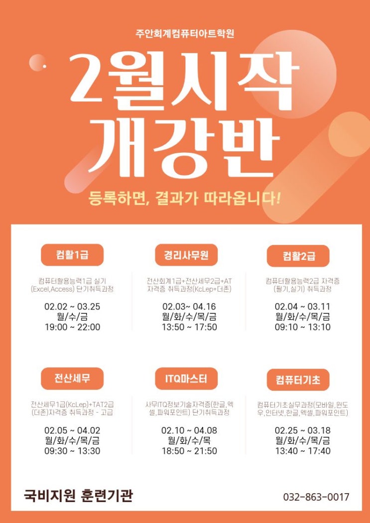 안녕하세요 주안회계컴퓨터아트학원입니다! 얼마전 2026 새해 개강공지 글을 올렸던 거 같은데, 벌써 2월 공지글을 올리게 되었네요! 시간이 왜이렇게 빠른거죠 2월은 ✔ 새해 계획을 아직 실행할 수 있는 마지막 시기이자 ✔ 3월을 준비하기 위한 가장 현실적인 출발점입니다. 국비지원 컴퓨터과정, 이런 분들께 꼭 필요합니다 컴퓨터 기초가 부족해서 어디서부터 시작해야 할지 모르시는 분 엑셀·한글·PPT 때문에 취업·업무에서 늘 불안하신 분 컴활, OA, 회계 자격증이 필요하지만 독학으로 한계를 느끼신 분 비용 부담 때문에 배우는 걸 계속 미뤄왔던 분 “나는 컴퓨터랑 안 맞아”라고 생각해왔던 분 문....... <img src="https://blogthumb.pstatic.net/MjAyNjAxMTNfMjc3/MDAxNzY4Mjc2MDM0ODM5.ufzg9_yq_3pZrQ0MNqGW0e3slM9aquzGzoV6FhpAtZAg.PQVFWnOT8AwXccrKNjswtluDhieuXLmqII4D4I797MQg.JPEG/%C1%A6%B8%F1%C0%BB_%C0%D4%B7%C2%C7%D8%C1%D6%BC%BC%BF%E4._%281%29.jpg?type=s3" />