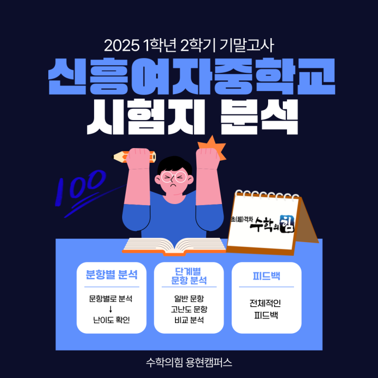 안녕하세요 수학의힘 용현캠퍼스입니다:) 기출 문제를 파악하는 것은 다음 시험을 대비하는 가장 중요한 첫걸음입니다. 그래서 오늘은 2025년 신흥여중 1학년 2학기 기말고사를 낱낱이 분석해보려고 합니다. 이번 시험의 난이도와 주요 문항을 함께 살펴볼까요? 문항별 분석 <난이도 구성> 하: 16문항 중하: 7문항 중: 3문항 이번 시험은 총 26문항으로 구성되었으며, 전반적으로 기초 개념을 확인하는 '하' 난이도의 비중이 상당히 높았습니다. 일반 문항 분석 '호의 길이는 중심각의 크기에 비례한다'는 성질을 이용하는 문제입니다. 어려운 문제는 아니지만 개념을 정확히 적용해야 풀 수 있는 문제였습니다. 고난....... <img src="https://blogthumb.pstatic.net/MjAyNjAyMTRfNjMg/MDAxNzcxMDM4NDgxOTE1.ahIXpRg5YcrAkCPd_tzQMsCh1-jYevHAMFD6swA2QvIg.rHWtV_fZTDHUIal4LckjQxYAJlCkQIsEz_KiCAN2H5gg.PNG/001.png?type=s3" />