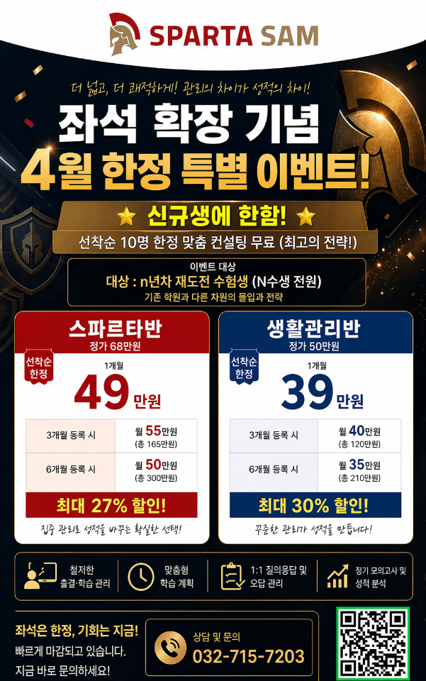 안녕하세요? 송도 관리형독서실 일취월장 입니다. 지금은 중간고사 기간이라 많이들 바쁜 시기입니다. 저희 일취월장도 아이들이 새벽1시 너머서 까지 정말 열심히 공부를 하고 있습니다. 하지만 다들 하는 예기가..중간고사만 끝나면 실컷 놀꺼야!! 5월에 엄청 놀꺼야! 하는 이야기를 하는데요. 오랜기간 교육계에 있었던 저는 이 기간이 정말 중요한 시기라고 다시 한 번 이야기 하고 싶습니다. 왜냐하면!! 기말고사는 정말 코 앞이거든요. 다시 힘들게 하지 말고 5월 연휴에 중간고사 오답도 정리하고... 중간고사에는 시험과목이 아니었지만 기말에 한꺼번에 보는 다른 과목도 정리하기에 정말 좋은 시기 입니다!!!! 그래서... 저희가 준비한....... <img src="https://blogthumb.pstatic.net/MjAyNjA0MTNfNDUg/MDAxNzc2MDY3NTE1MjU1.BokZsH07S74Aj-4YD9AXsWYHGUTbePSNcyzZTAIDnhEg.PRSRBCqBk0TyfLnIi32CEXcL5mmh8KeqLeHzmgPgpw4g.JPEG/5%BF%F9%B0%FC%B8%AE%B9%DD.jpg?type=s3" />