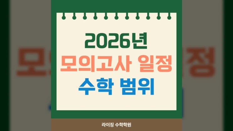동춘동 고등 수학학원 라이징 학원에서 고등학생들을 대상으로 시행되는 2026년 모의고사 일정과 수학 과목에 대한 출제 범위를 안내해 드리도록 할게요. 고1, 2학년 모의고사 일정 및 수학 범위 1) 3월 24일 (화), 서울 교육청 주관 - 1학년 범위 : 중학교 전 범위 - 2학년 : 공통수학 1, 2 전체 2) 6월 4일 (목), 부산 교육청 주관 - 1학년 : 공통수학 1(여러 가지 부등식) - 2학년 : 수 1, 수 2 전 범위, 대수(삼각함수) 3) 9월 2일 (수), 인천 교육청 주관 - 1학년 : 공통수학 1 전 범위 - 2학년 : 대수(전 범위), 미적분 1(함수의 극한) 4) 10월 20일 (화), 경기도 교육청 주관 - 1학년 : 공통수학 1 전 범위 - 2학년 : 대수(전 범위), 미적....... <img src="https://phinf.pstatic.net/image.nmv/blog_2026_02_24_2069/OzwBXNPQOd_01.jpg?type=f480x480" />