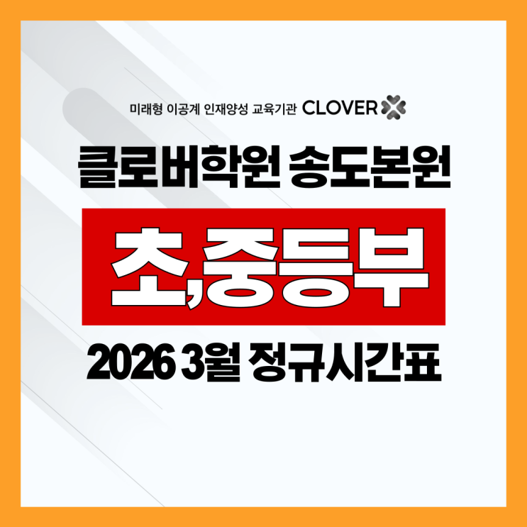▼ 신규 개강 시간표 ▼ 클로버학원에서는 학부모님들과의 소통을 가장 중요하게 생각하며, 다양한 채널을 통해 항상 함께하고 있습니다. 클로버 공식 카페, 유튜브 영상, 카카오톡 채널, 인스타그램을 통해 더 많은 정보를 제공하고 있으니 언제든지 문의해 주세요. 클로버학원 공식 카페 바로가기 온라인 상담 신청서 제출 전화 상담으로 신청 위치 안내 인천시 연수구 송도동 21-1, 비엠빌딩 5,6,7층 클로버학원 송도본원 이 글이 도움이 되셨나요? 좋아요를 눌러 주시고, 공유하여 더 많은 분들과 함께 유용한 정보를 나눠 보세요! "Clover It All!" <img src="https://blogthumb.pstatic.net/MjAyNjAzMDNfMjIw/MDAxNzcyNTIyNDU3NDk3.iIJx-pvNZVPfnEtGmuQCwhB3kpk7kKeorWk03GTBpDEg.SNs5TcD5zteGVQaEe-msdlN5ZLF3wYFbM9_gvJYa-9Eg.PNG/%C5%AC%B7%CE%B9%F6-%BD%C3%B0%A3%C7%A5-%C4%BF%B9%F6-%C0%CC%B9%CC%C1%F6-001.png?type=s3" />