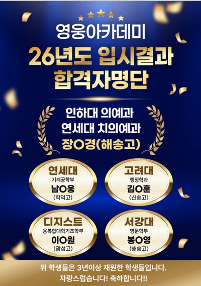 안녕하세요~영웅 지킴이입니다. 오늘은 매해 상위 대학을 합격시키는 영웅아카데미의 비밀공간을 소개해 드리고자 합니다~ 영웅아카데미 비밀공간에서 탄생한 의대, 연/고대 학생들 올해 역시 송도 내 고등학교에서 의대를 비롯해서 연대, 고대 등 상위 대학을 합격시켰습니다!! 아래에 학생들은 영웅아카데미에서 3년 이상, 종강까지 수강했던 학생들입니다^^ (1~2년 수강했던 학생들은 게시하지 않습니다.) 과연 이 학생들이 영웅아카데미의 어떤 공간에서 공부를 했기에 이렇게 훌륭한 학교에 합격했을까요? 비밀은 바로 "영웅아카데미 자기주도학습실"입니다! 목표대학을 꿈꾸며 성장하는 곳! 영웅아카데미 자기주도학습실 학원 수....... <img src="https://blogthumb.pstatic.net/MjAyNjAzMDRfMjk2/MDAxNzcyNTU0MTU5NDc3.Wz5E-y6nC5OleROjLien9F1WAlgvpHS2JnMQ265Q2jsg.14RRadqGXUSXQVhC7_6IV0gnPXxTYBAwb7S2sV7QdyAg.JPEG/%C8%AD%B8%E9_%C4%B8%C3%B3_2026-03-02_005104.jpg?type=s3" />