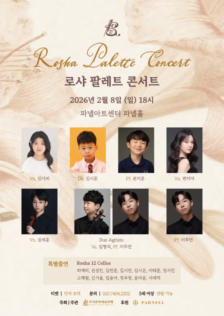 로샤 팔레트 콘서트 2026.2.7 (일) 18시 파넬 아트센터 파넬홀 국내의 우수한 콩쿨에서 뛰어난 재능으로 클레식 음악 유망주들이 연주하는 콘서트 피아노 앞에서 언제나 진심을 다하는 지훈이,꿈을 향해 열정을 다하는 모습이 참 귀하고 미래의 깊이있는 진정한 연주가가 되기를 바랍니다. 많은 관심과 격려해주세요! <img src="https://blogthumb.pstatic.net/MjAyNjAyMDdfNSAg/MDAxNzcwNDQ1MzkzNzQ2._1ROeYfEb1jecPhra4YWWcUFYOkhEizZQI8Dyoeb1q0g.U8Zoe3A4VuFrG5yItiY8XV3uI62AfVcgg7y2zp_aQPcg.PNG/900%A3%DF1770444728023.png?type=s3" />