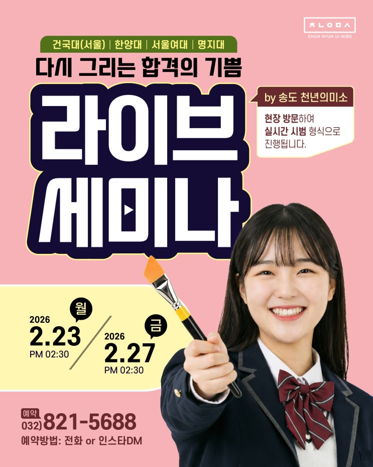 행복했던 26년도 입시를 감사한 마음으로 마무리 했습니다 100프로 합격이 아니라 마음 한구석이 아프지만 올 해 좋은 결과를 받지 못 한 아이들 또한 우리 자식들이니 한번 더 안고 가려합니다 힘내자 00야!!! 자랑스러운 우리 아이들 얼마나 잘하는지 자랑하고도 싶고 후배들에게 가르침도 주고 싶어서 합격생들의 실시간 재현작 시범을 눈앞에서 직적 경험해 볼 수 있는 시간을 마련했습니다 우리 학원 후배들은 물론이고 다니지 않더라도 건국대를 서울여대를 한양대를 명지대를 꼭 합격하고 싶은 친구들은 모두 다 환영입니다!!! 2월 23일 27일 2시30분에 만나요~~*^^* 예약은 필수 032-821-5688 #송도천년의미소 #홍익대 #건국대서울 #건국....... <img src="https://blogthumb.pstatic.net/MjAyNjAyMTFfMjM4/MDAxNzcwNzg2NTk5NjY3.dxfzowpH57Gg4K1PyDyo_WAjQ1_8Z2Gq0Gfks8segJIg.NHDxLTtBkVaYW3zb3wkaqMDiEVZrg87Iuo05zZDNlt0g.JPEG/KakaoTalk_20260211_140658559.jpg?type=s3" />