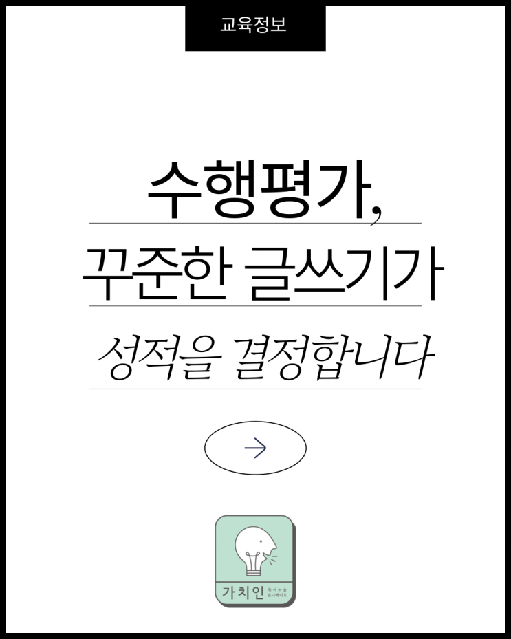 교육정보 : 수행평가, 꾸준한 글쓰기가 성적을 결정합니다. 즉, 단 한 번의 시험이 아니라 수업 과정 속에서 사고력과 표현력을 평가합니다. 글쓰기 실력은 단순히 국어 성적을 넘어, 모든 교과 수행평가에서 학생의 사고력을 보여주는 기준이 되고 있습니다. 가치인은 이 변화에 맞춰, 과정 중심 글쓰기 훈련 프로그램을 운영합니다. 주제를 이해하고, 자신의 생각을 논리적으로 정리해 글로 표현하는 능력이 성적의 핵심이 되었습니다. 꾸준한 글쓰기 훈련은 수행평가에서 점수뿐 아니라 자신감 있는 발표력과 사고력으로 이어집니다. 즉, 학생이 스스로 생각하고 표현하는 힘이 모든 교과의 핵심이 된 것입니다. 이제는 암기보다 사고의 과정....... <img src="https://blogthumb.pstatic.net/MjAyNjAyMjZfMjgx/MDAxNzcyMTE0OTI4MDcw.1CVTZOXa2VfwMbd8ZBqaeDW5wRjzCTUOxhPNkC68Kbsg.-N3K3Sj3fd2cGQrrFyY1FUZpdfCaUBTrmNdfbWrSD3sg.PNG/1.png?type=s3" />